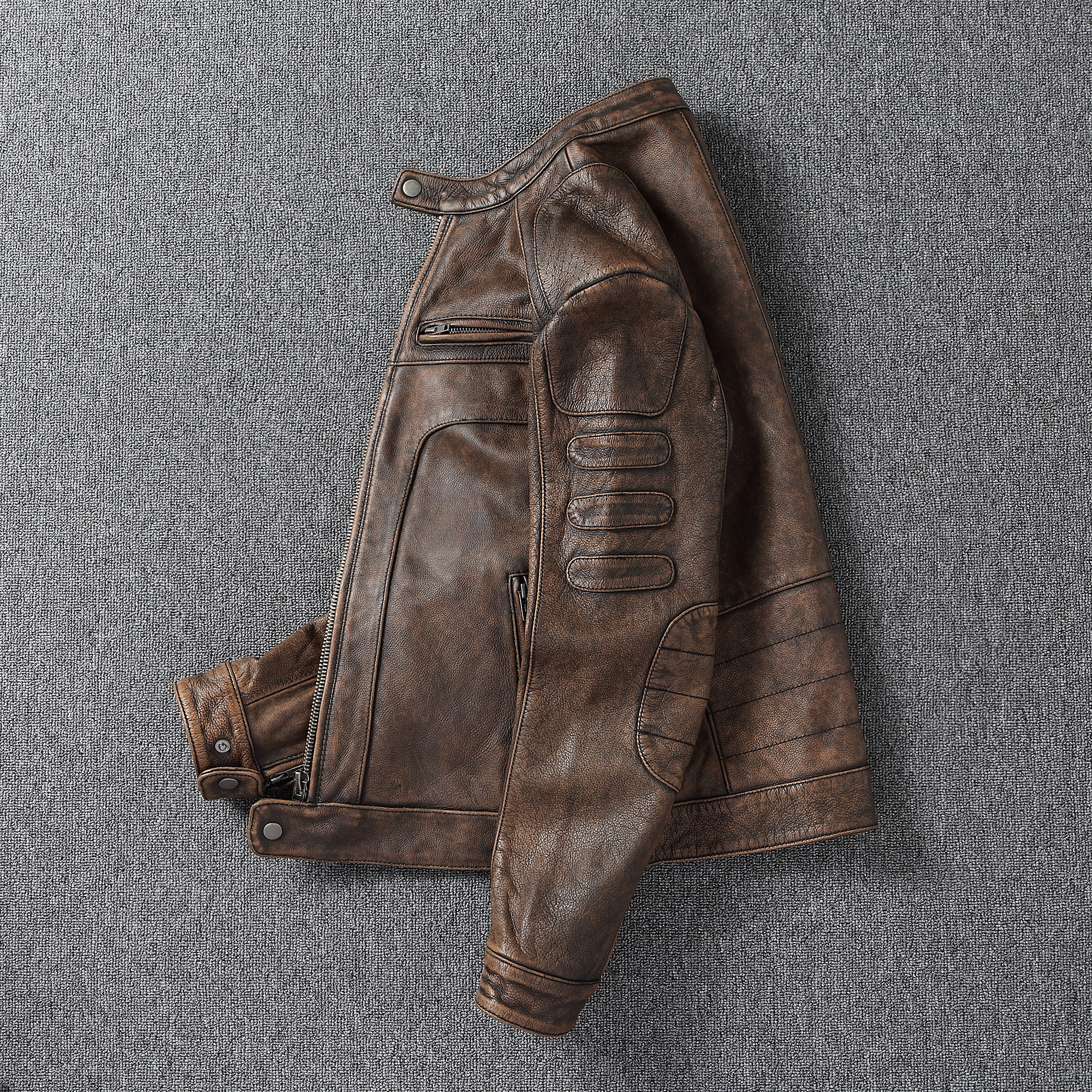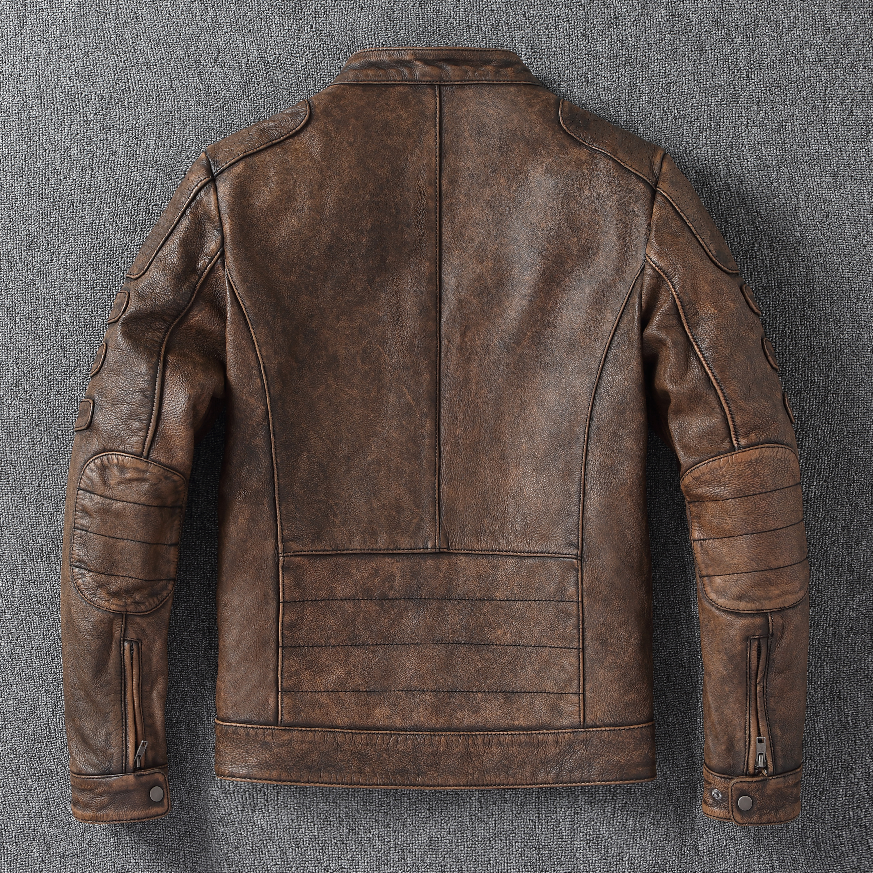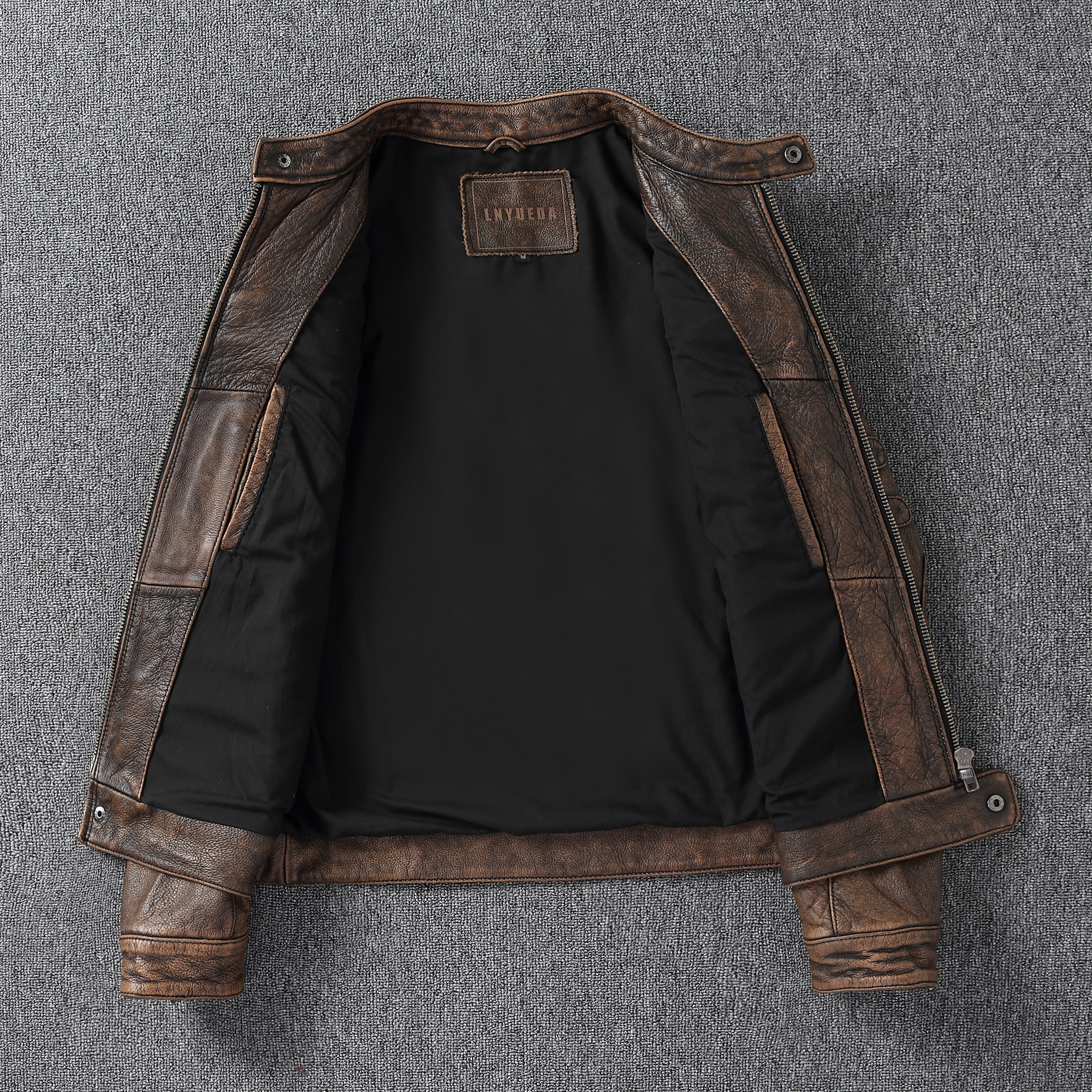 阿美咔叽头层牛皮机车服美式复古真皮皮衣男士短款立领皮夹克潮