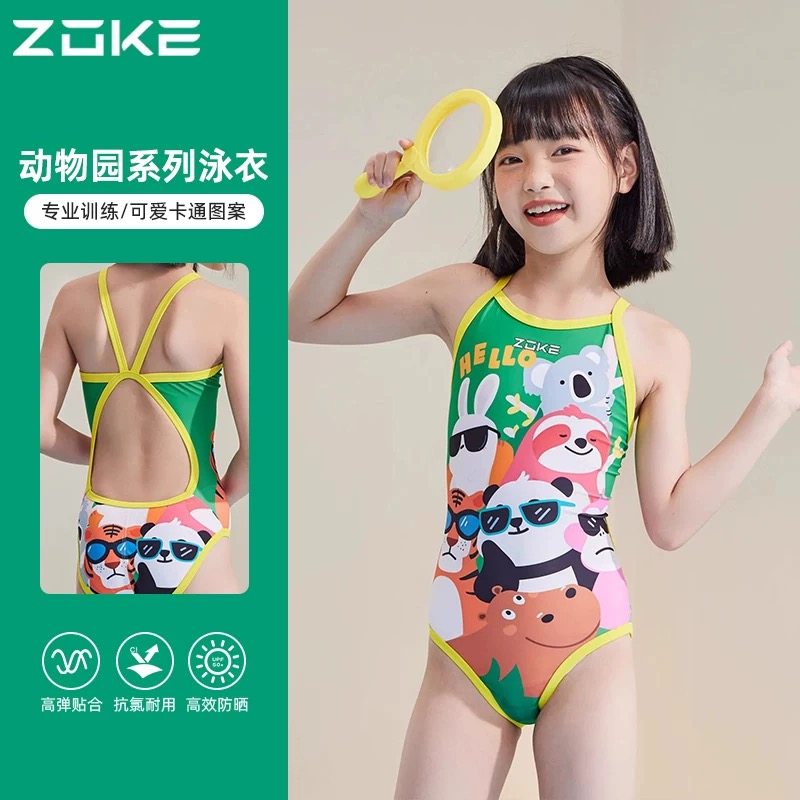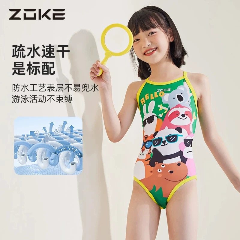 洲克zoke儿童泳衣连体三角女孩专业训练比赛中大童速干竞技泳装