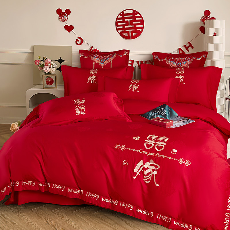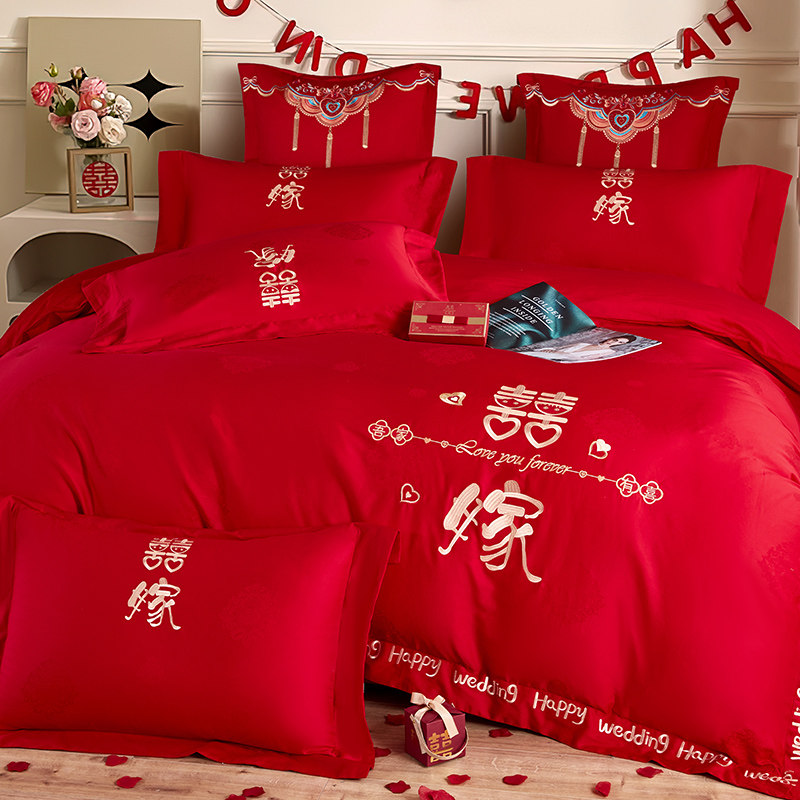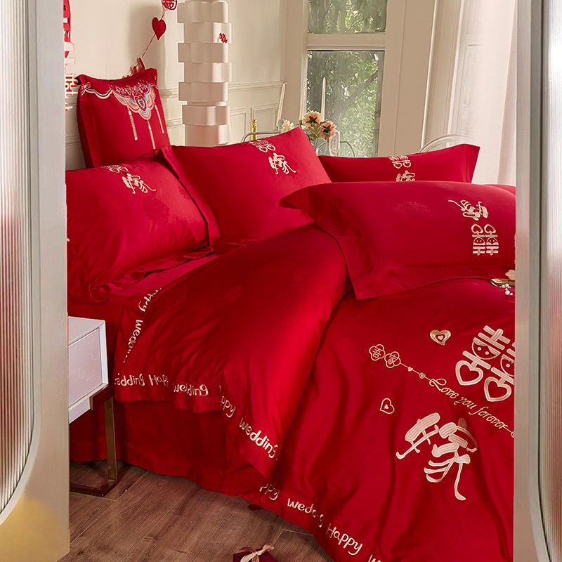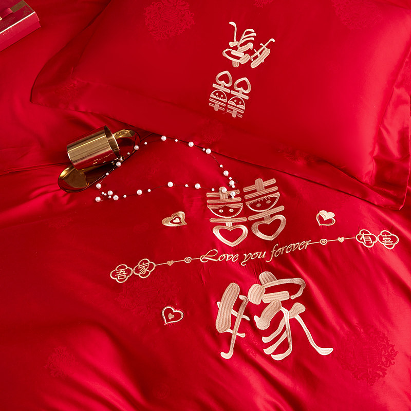 高档新婚庆床品四件套100支长绒棉双喜刺绣红色结婚被套床单纯棉
