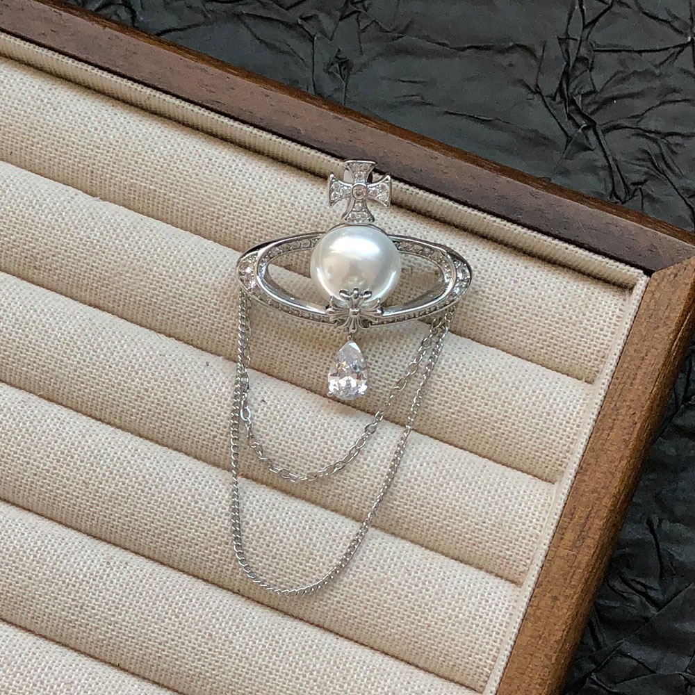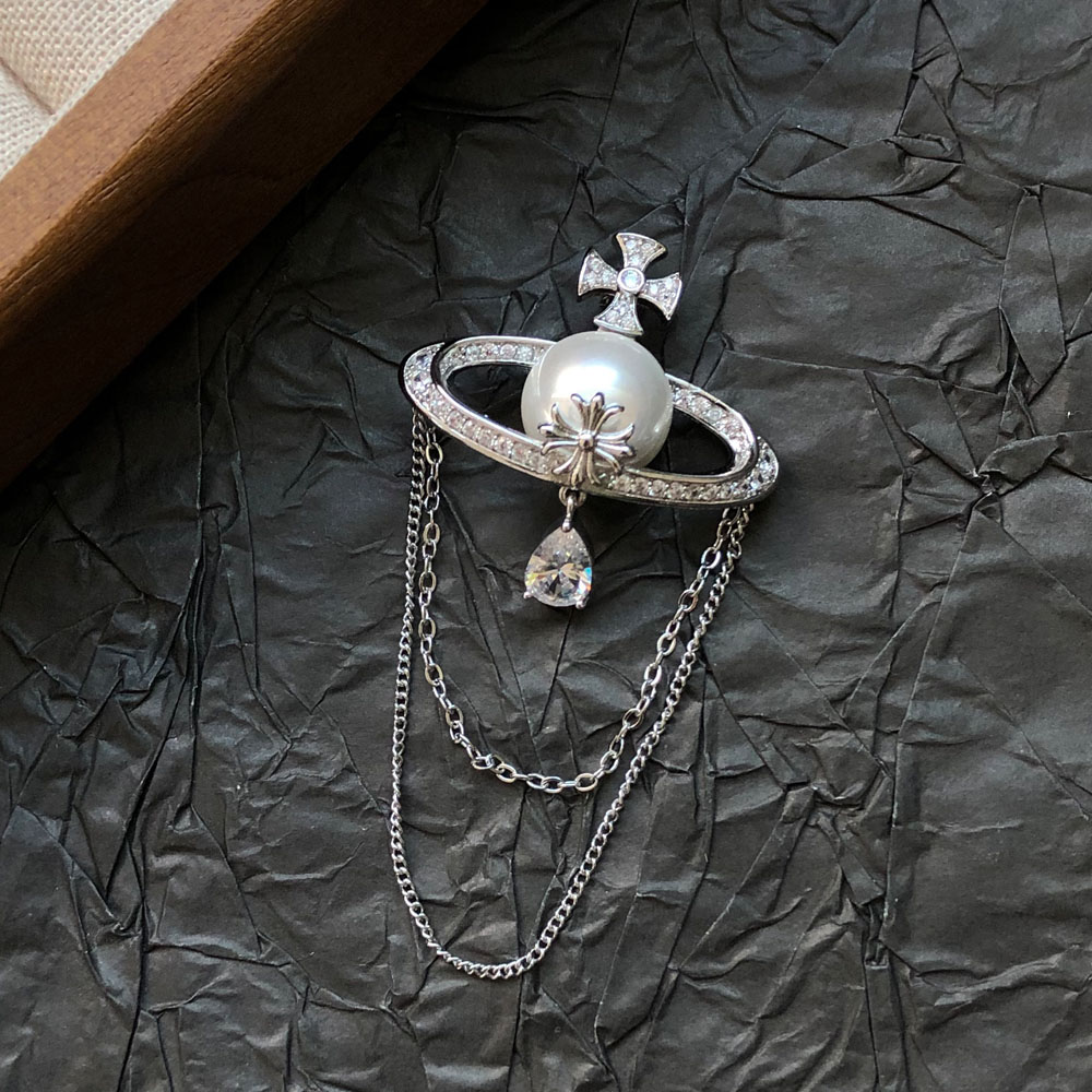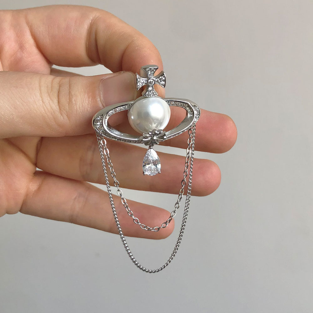 流苏珍珠水钻胸针女高档闪钻锆石金属链胸花别针精致时尚小众配饰