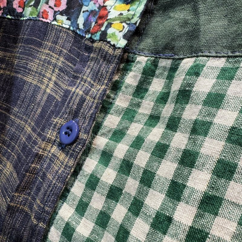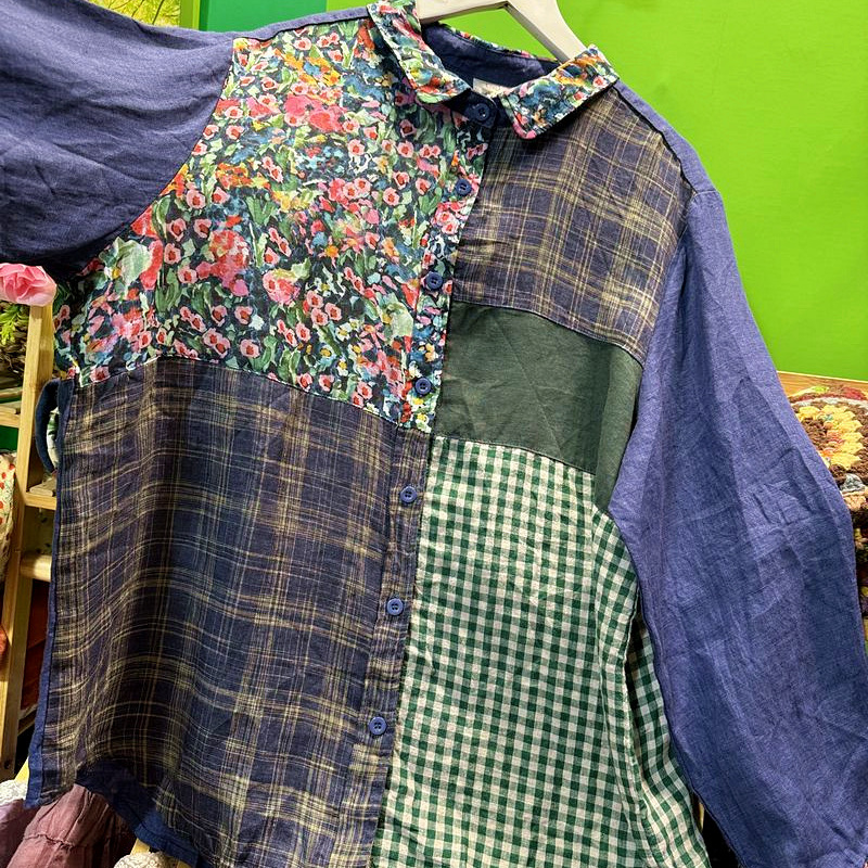 熊姑娘拼接衬衫/复古拼布棉麻2025春秋长袖宽松大码上衣女士翻领
