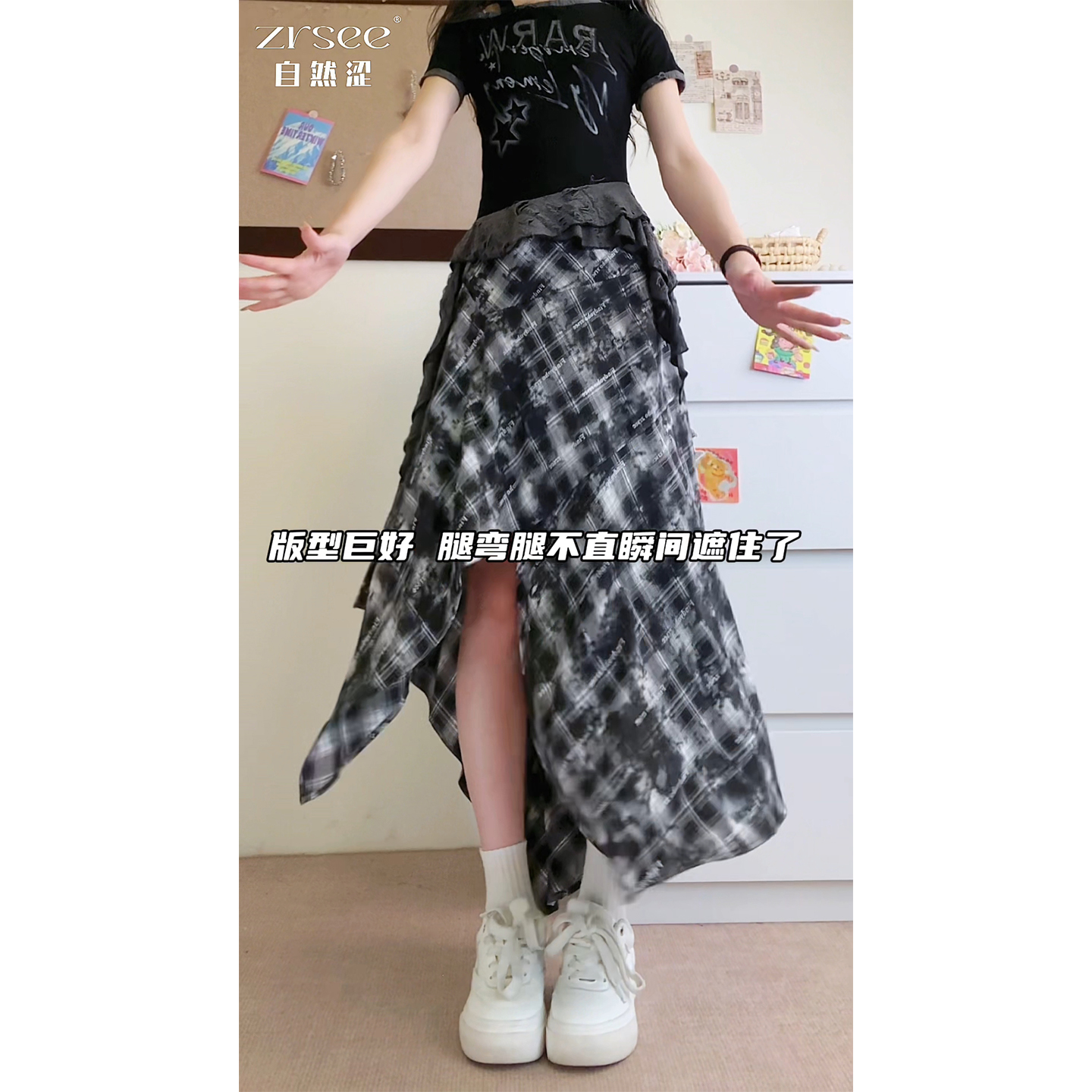 自然涩美式格子半身裙女夏薄款高腰高级感撞色不规则a字长裙子