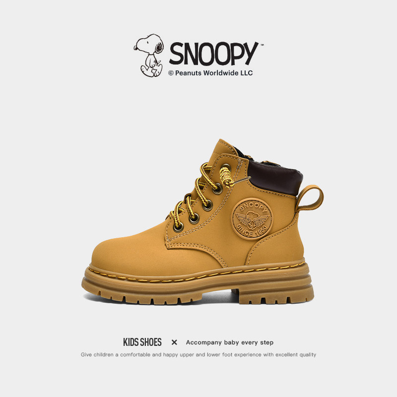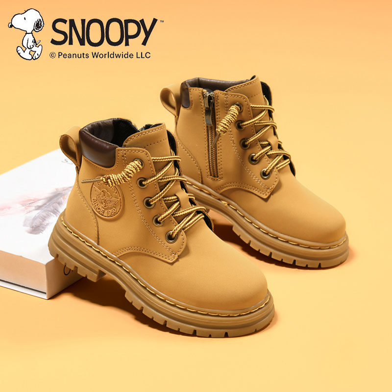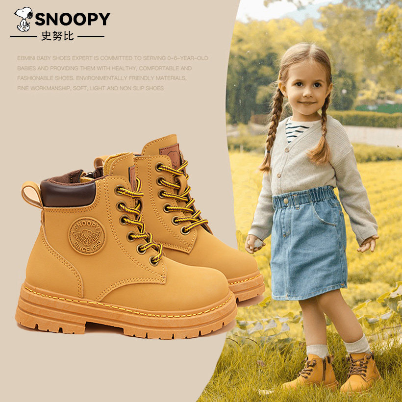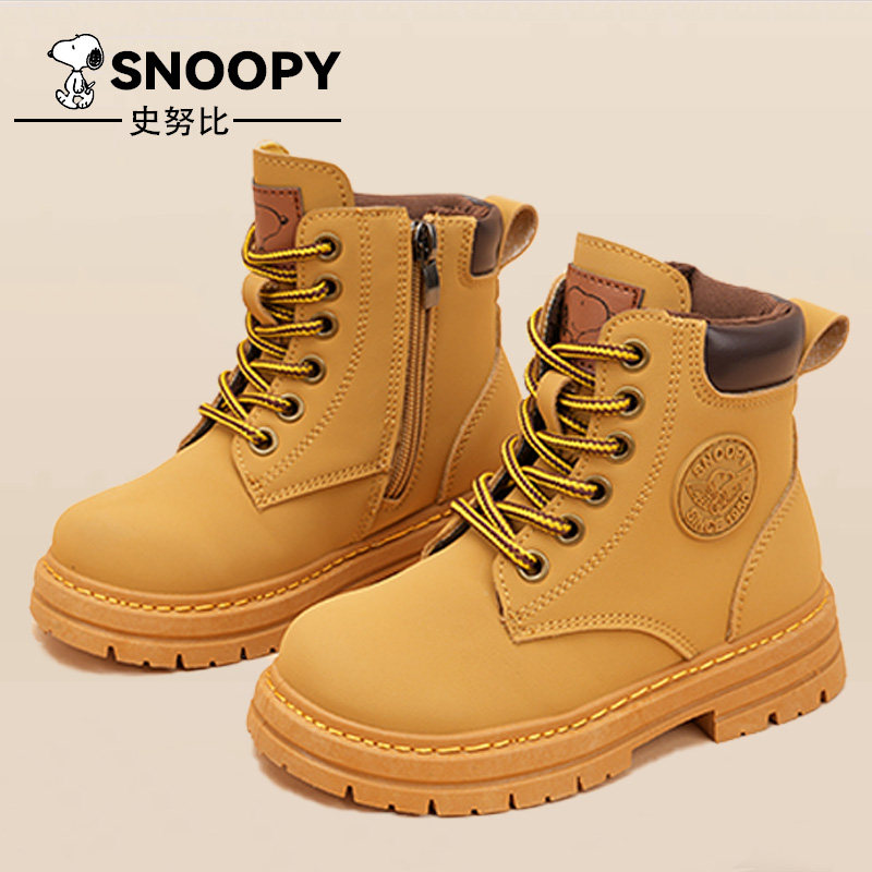 史努比儿童靴子男秋季男童马丁靴女童短靴草原皮靴单靴户外大黄靴