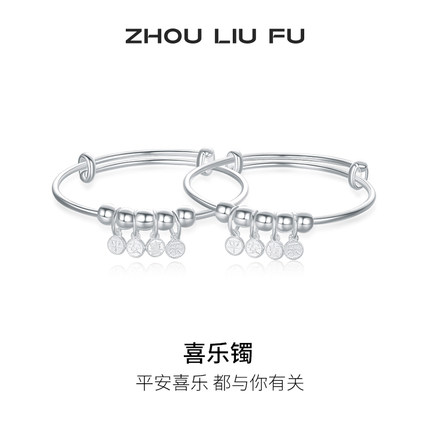 周六福银手镯女S990足银平安喜乐字符银镯宝宝款银饰礼物