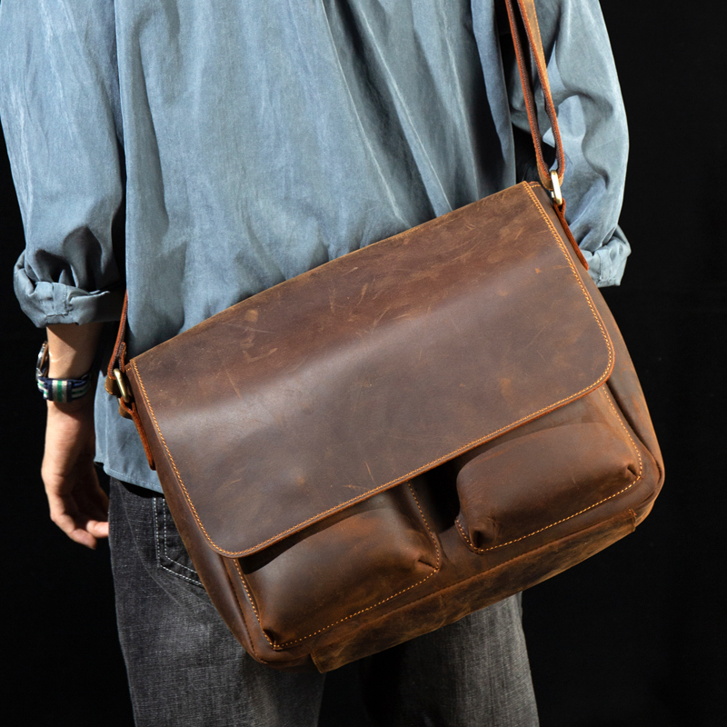 慢时光大容量复古疯马皮男包手工头层牛皮个性真皮邮差单肩斜挎包