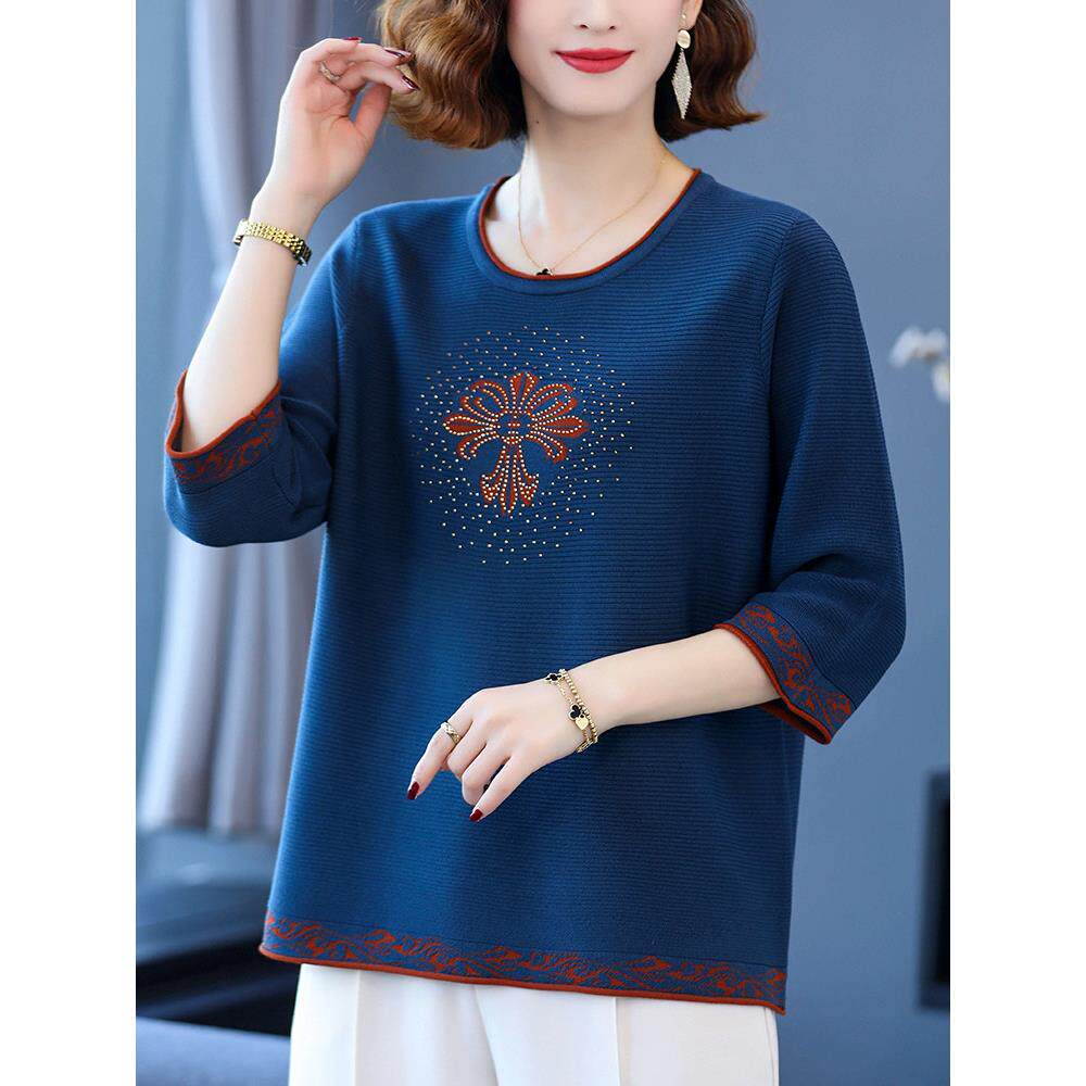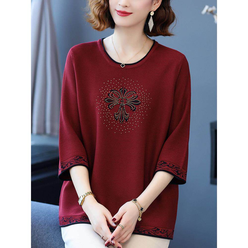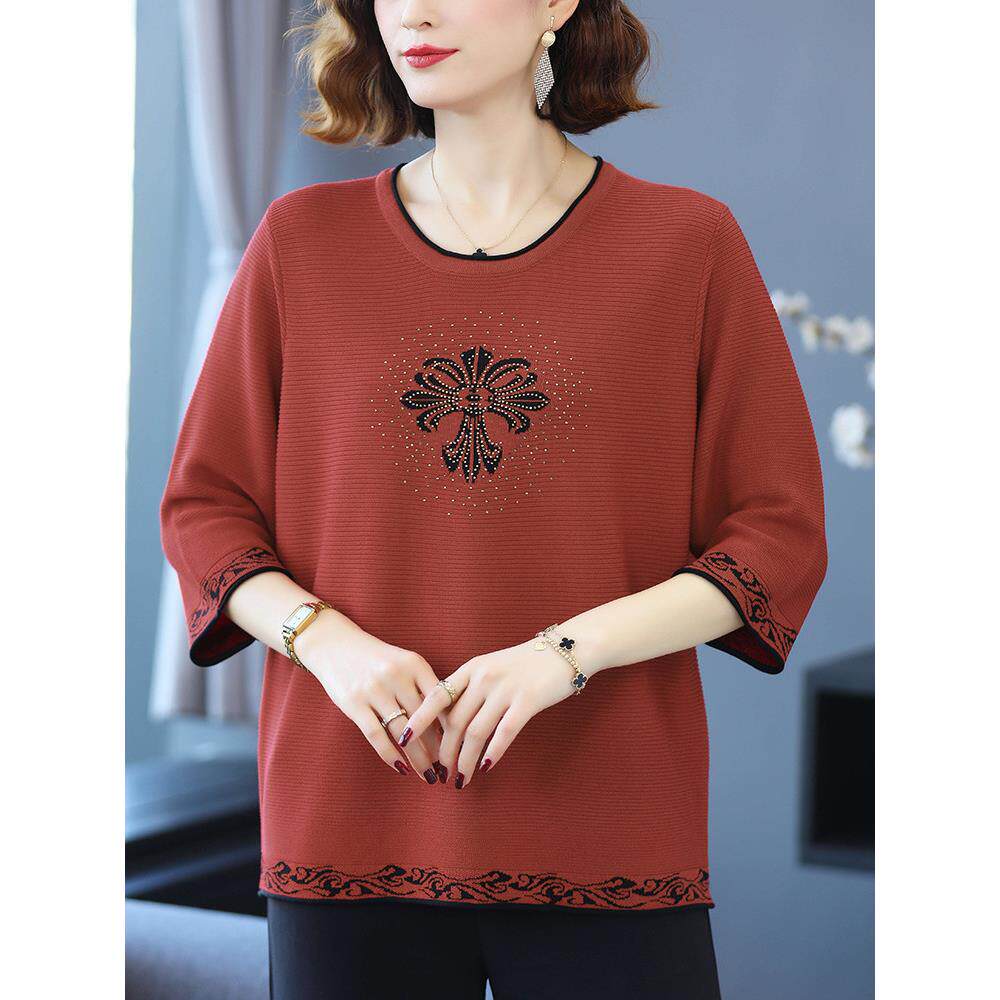 妈妈装桑蚕丝中袖上衣女中老年冰丝t恤2025新款加肥加大码针织衫