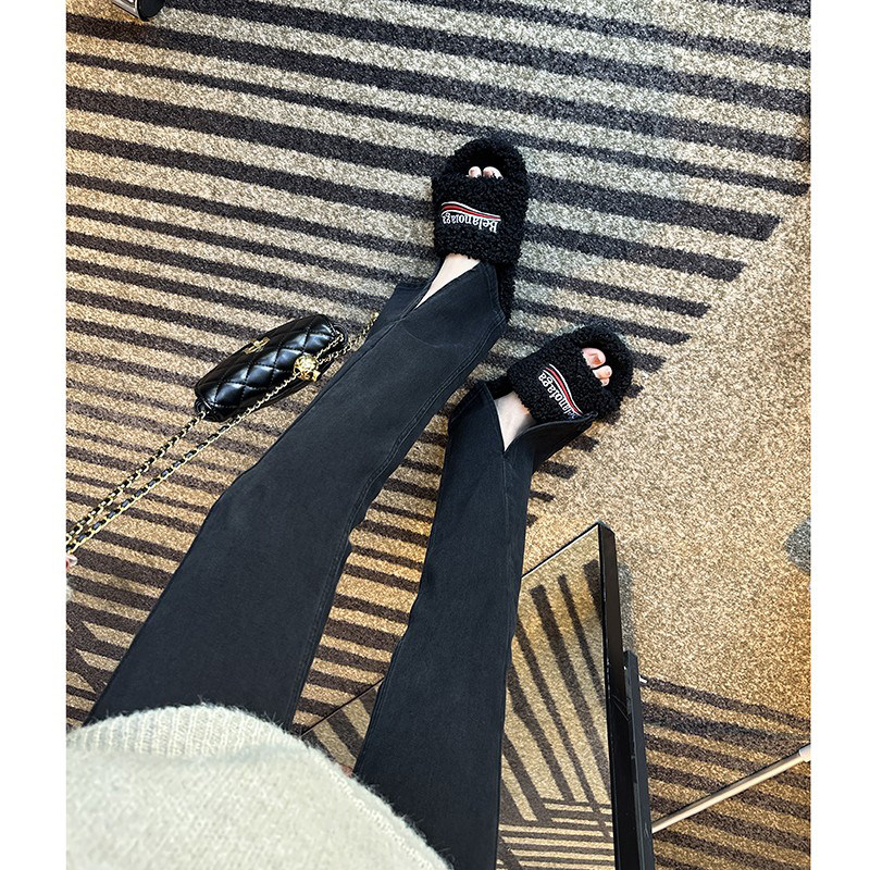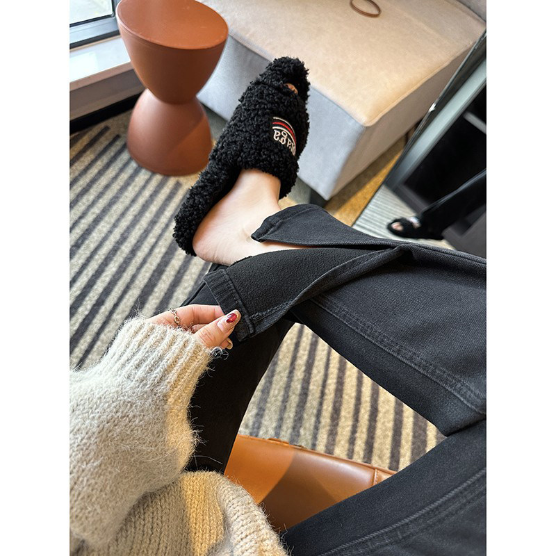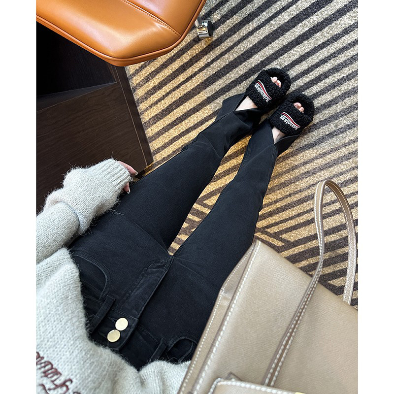 wu敌显瘦!!黑色开叉加绒牛仔裤女秋冬2025新款高腰修身微喇叭裤