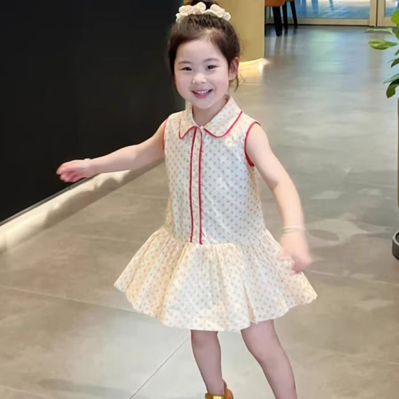 韩版女童2025夏季新款白色碎花无袖连衣裙女孩可爱撞色翻领背心裙