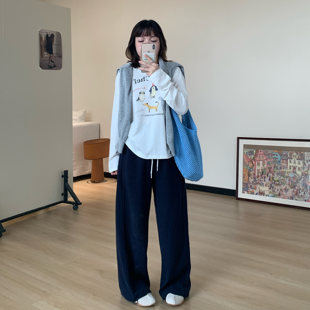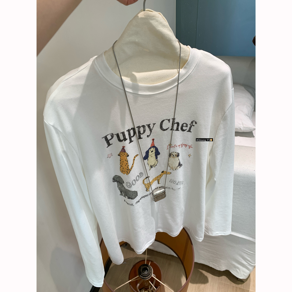 Omang桃喜 韩系甜美卡通印花长袖T恤女早秋宽松休闲百搭白色上衣