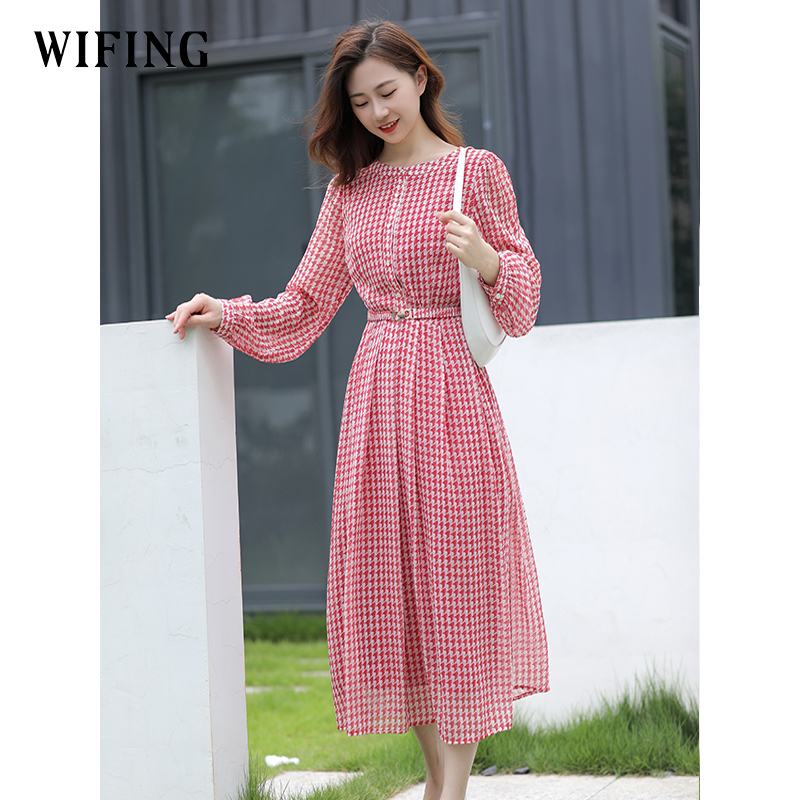 未风时尚气质长裙女2025秋装新款收腰长袖裙子早秋红色雪纺连衣裙