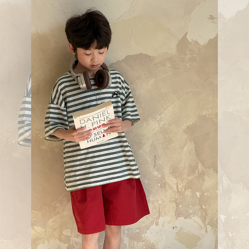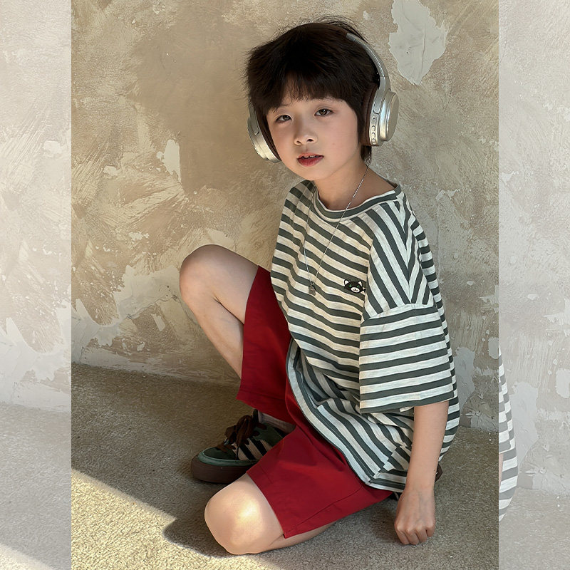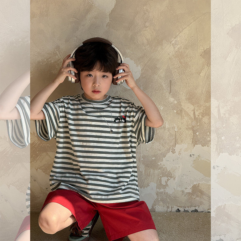 虾酱麻麻男童条纹短袖t恤纯棉夏装2025新款男孩撞色圆领儿童体恤