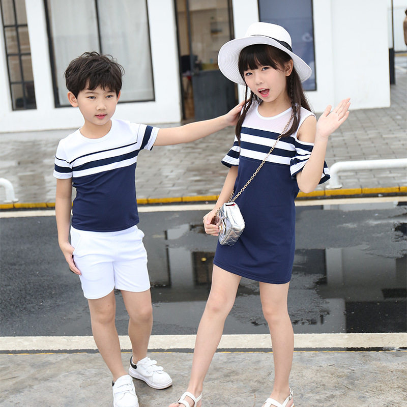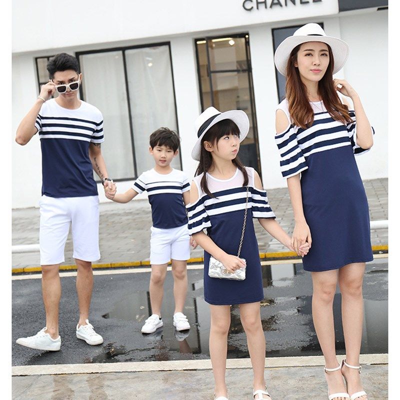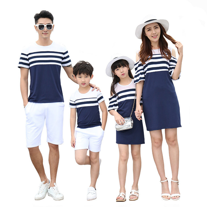 2021夏季新款时尚亲子装夏装母女连衣裙条纹短袖纯棉t恤全家套装