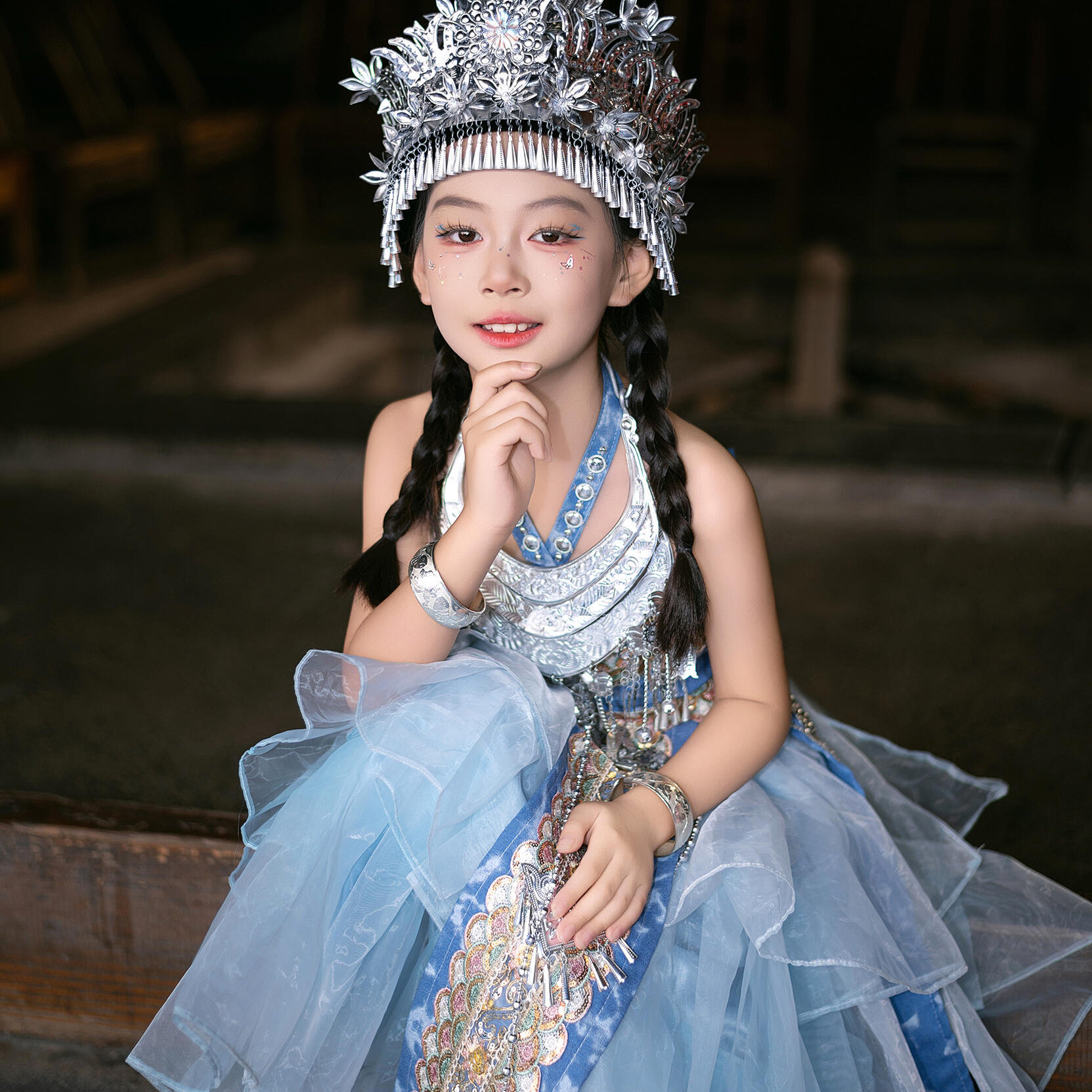 女童少数民族风服饰蓝色连衣裙儿童苗疆公主贵州云南彝族大凉山