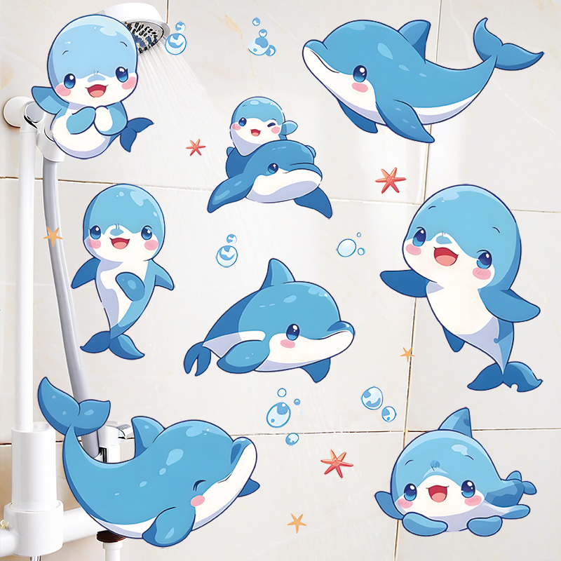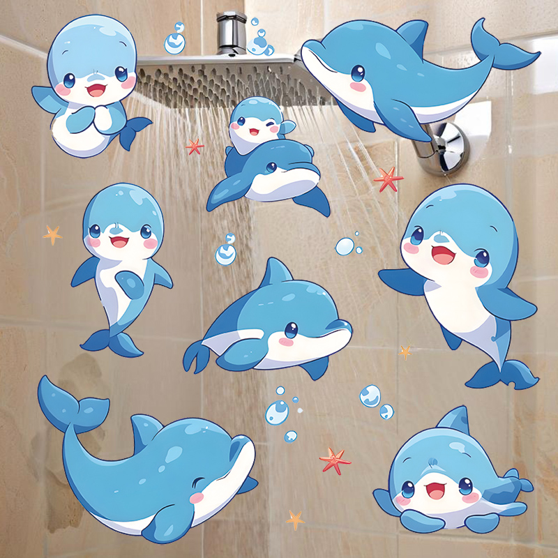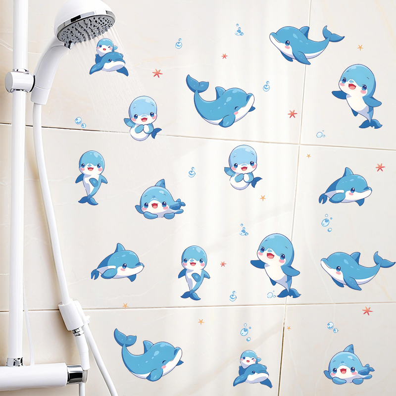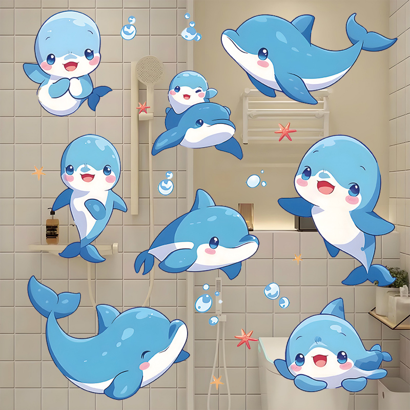 蓝色小海豚卡通个性可爱温馨卧室玻璃墙美化遮丑防水自粘墙贴