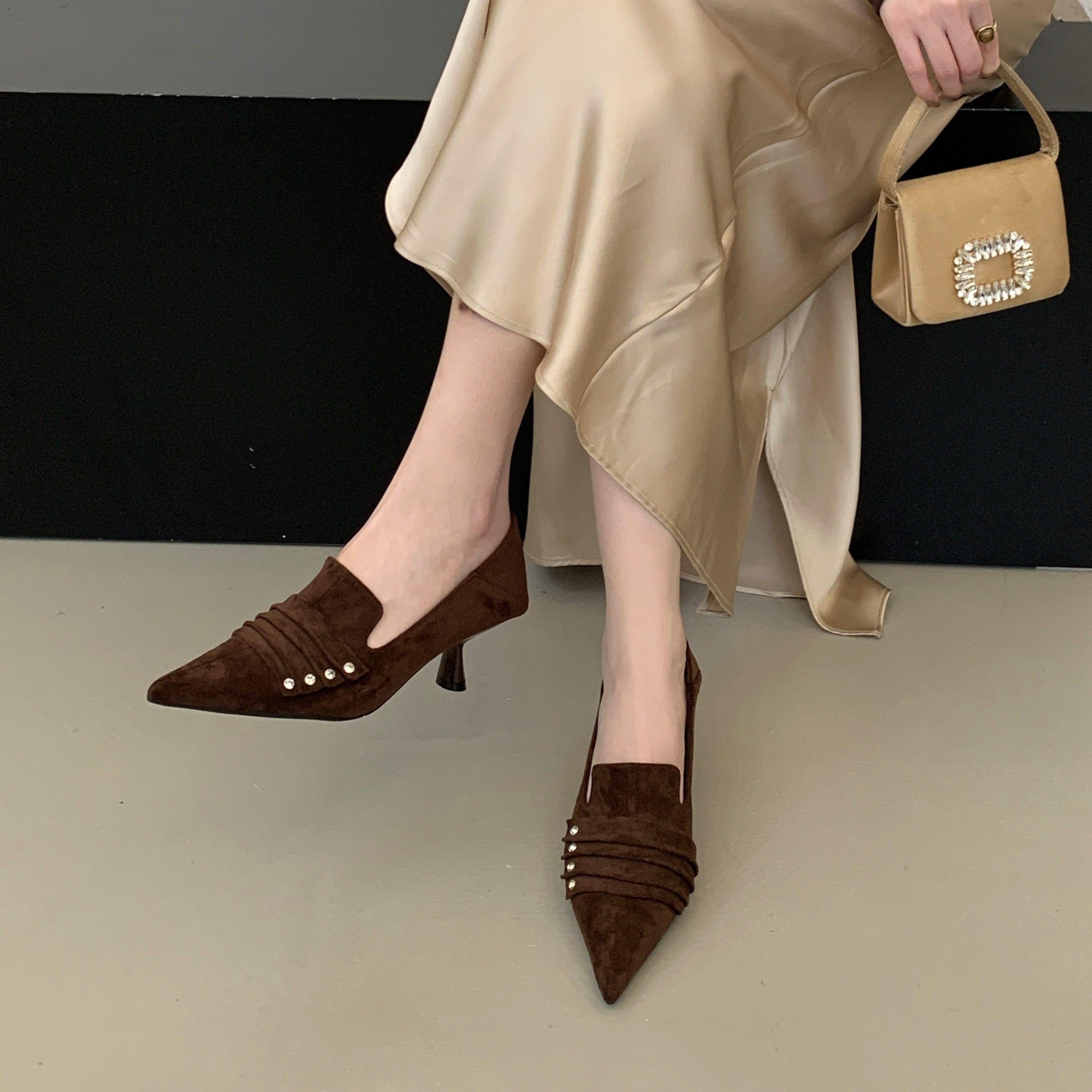 2026早春季新款尖头细跟高跟鞋通勤浅口女单鞋金属扣高级感小皮鞋