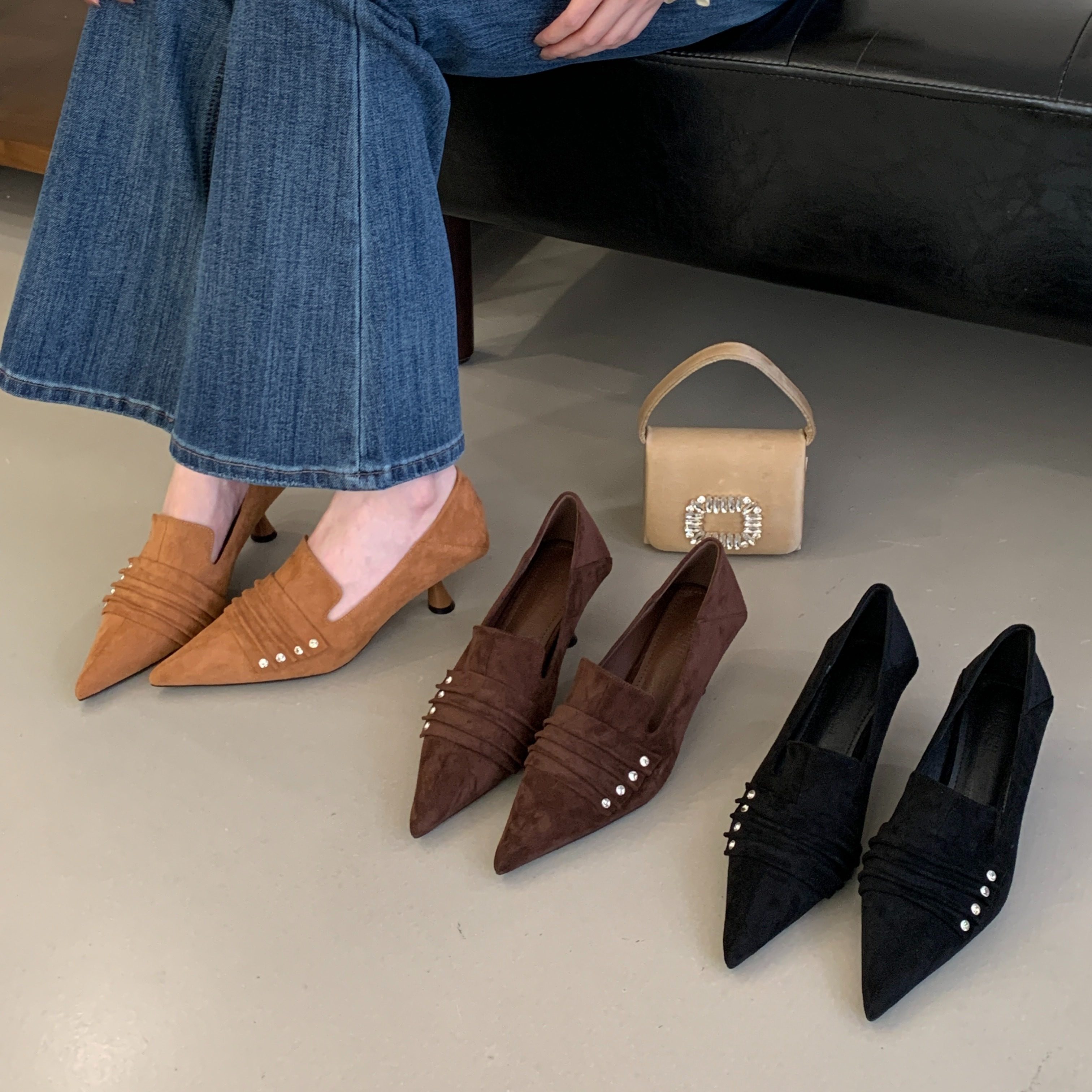 浅口复古尖头单鞋金属扣