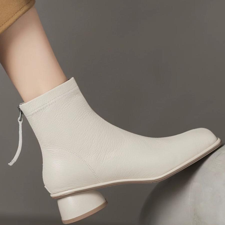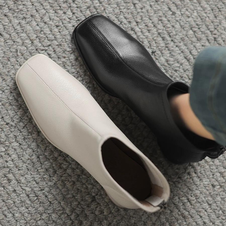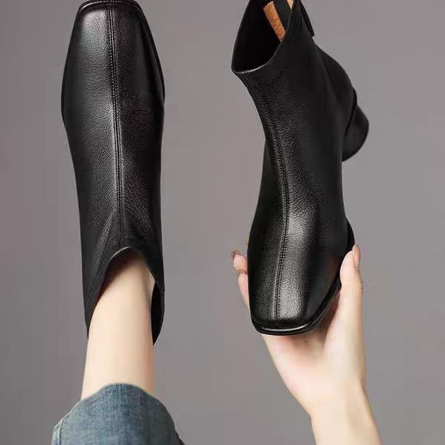超软小羊皮短靴女秋冬季粗跟中跟软底方头法式洋气瘦瘦靴真皮软皮