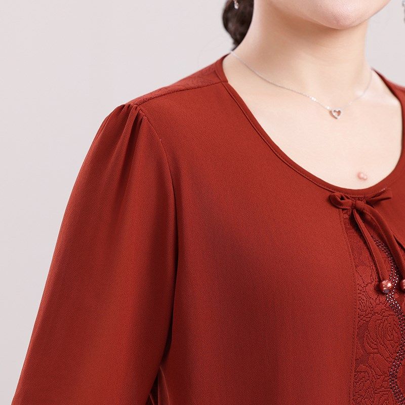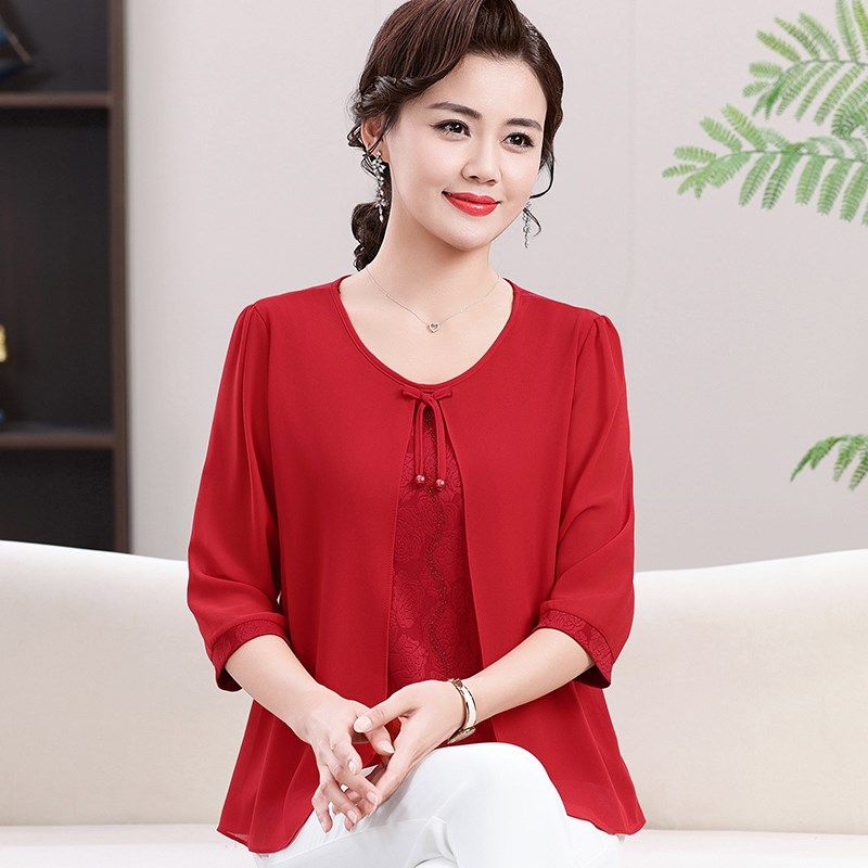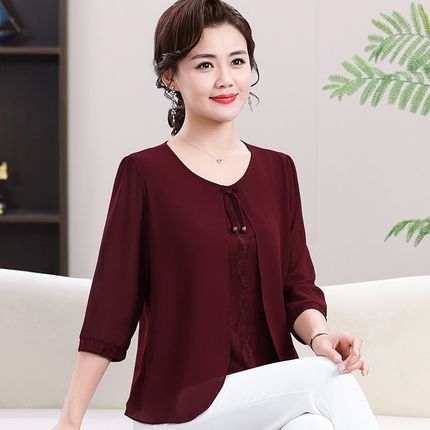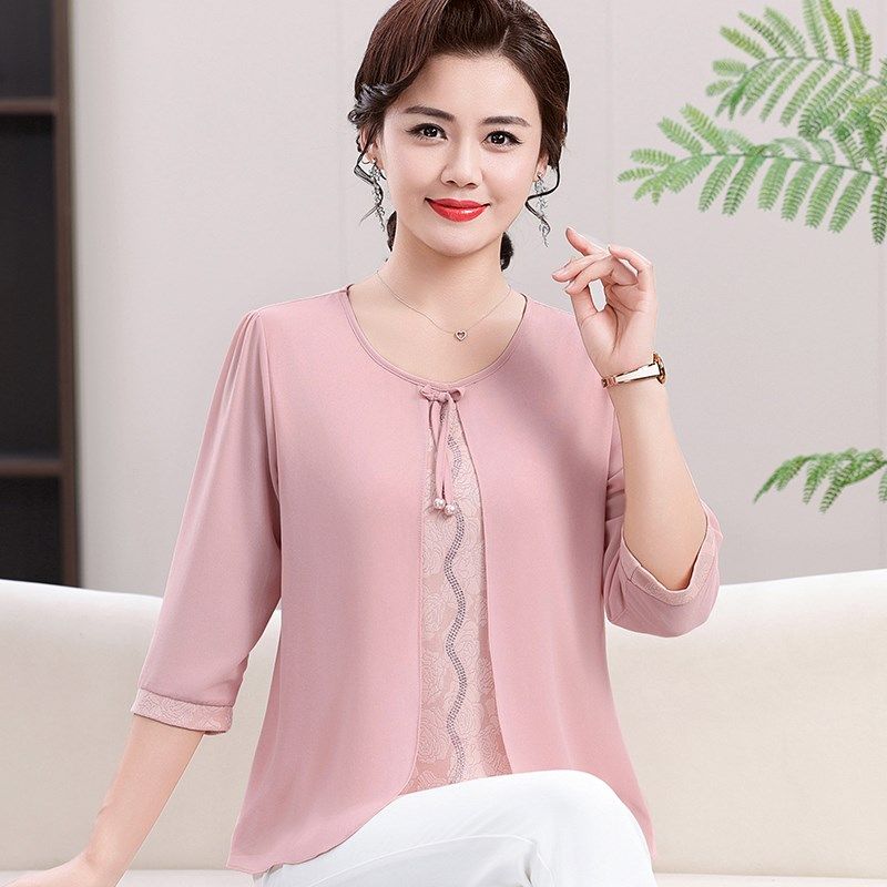 2025新款妈妈夏装雪纺小衫中老年女装春装洋气上衣假两件T恤套装