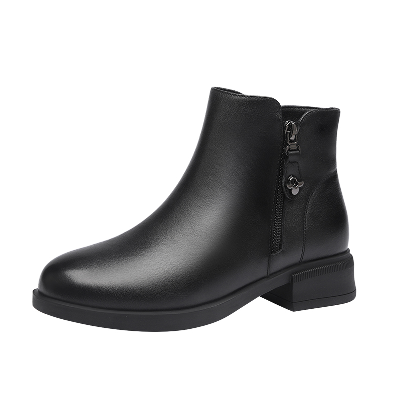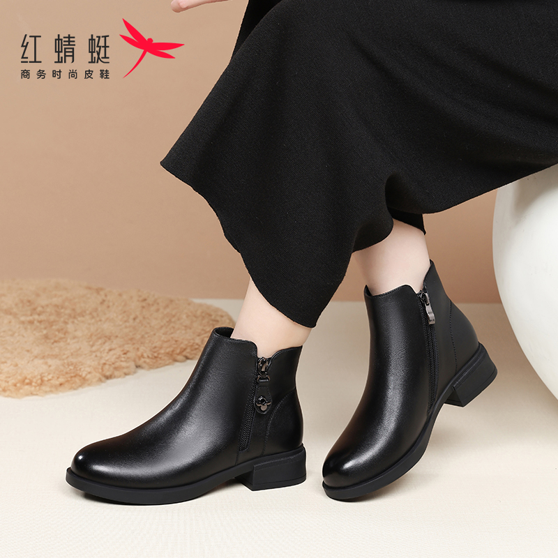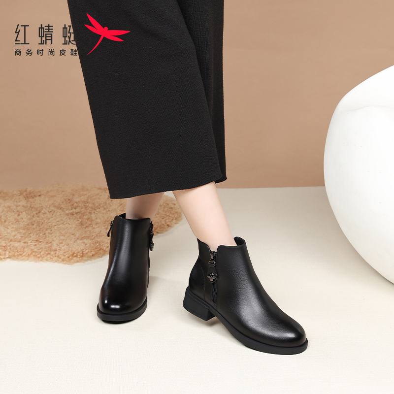 红蜻蜓真皮靴子女加绒粗跟短靴2025冬季新款女靴短筒加棉切尔西靴