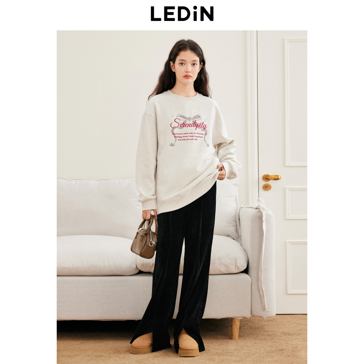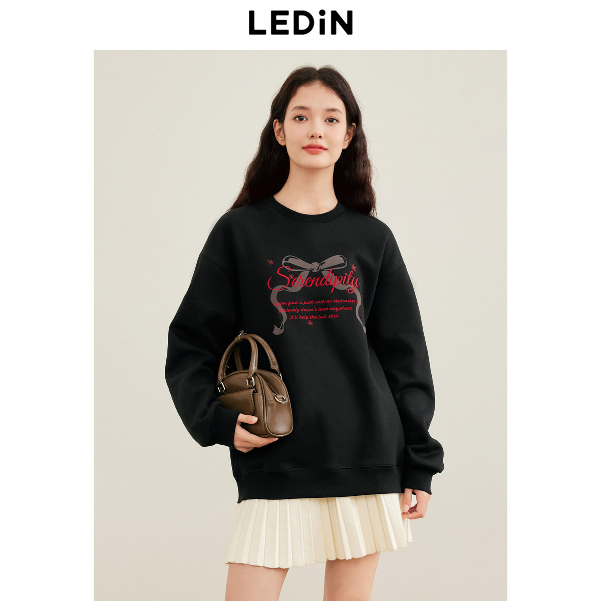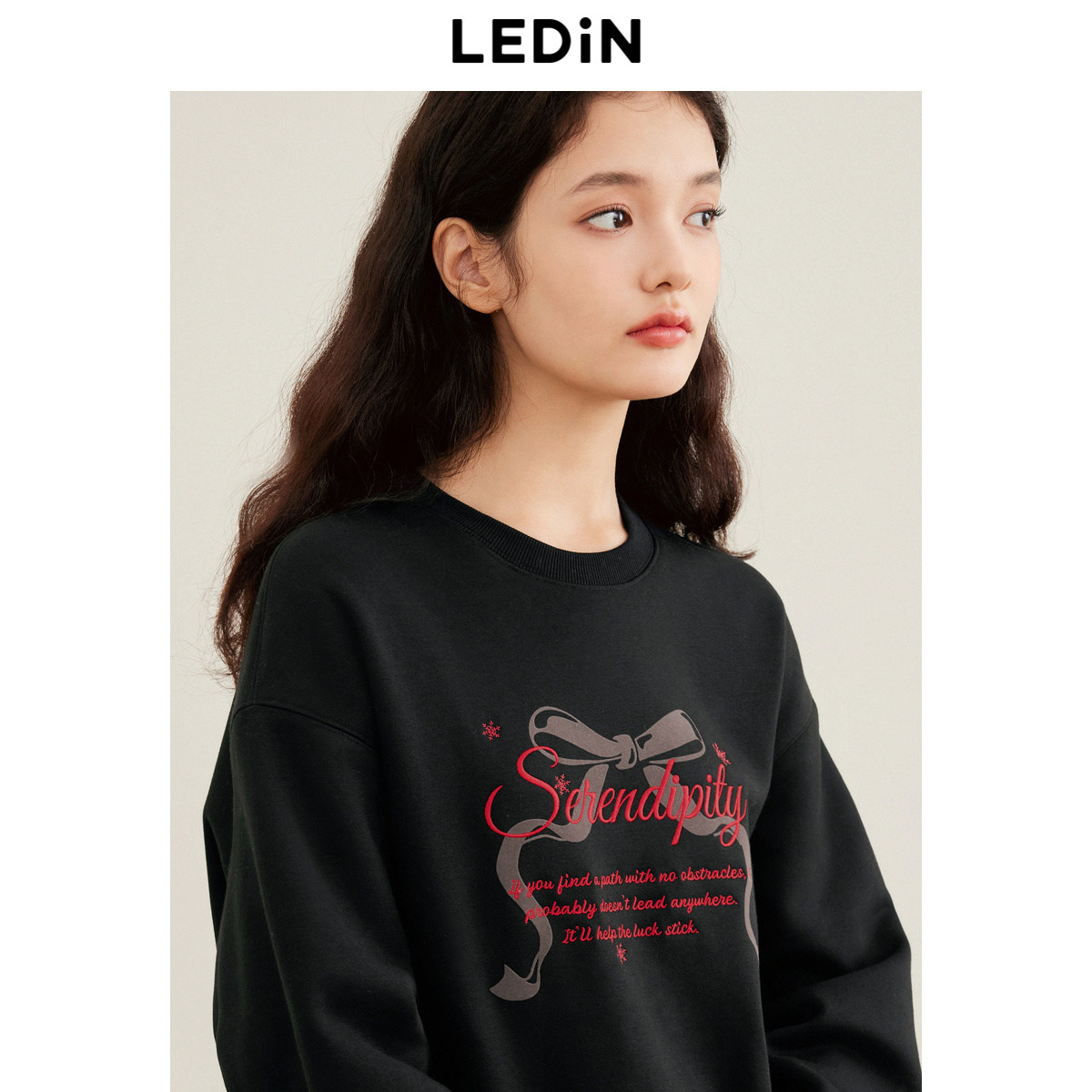 乐町蝴蝶结印花圆领卫衣女装冬宽松落肩字母刺绣上衣
