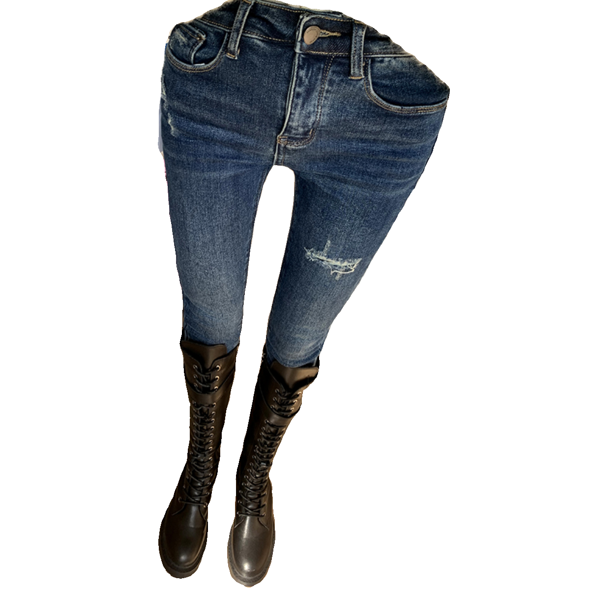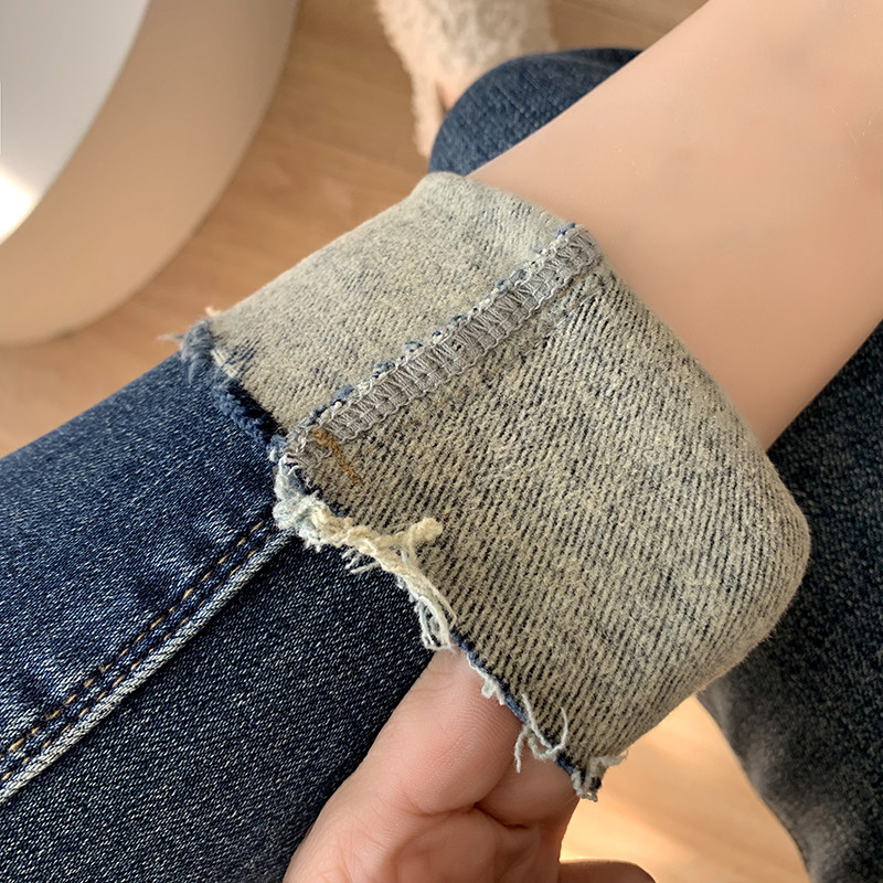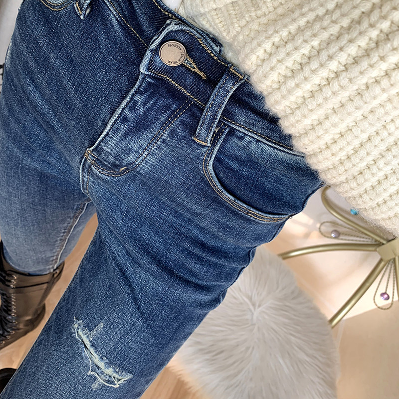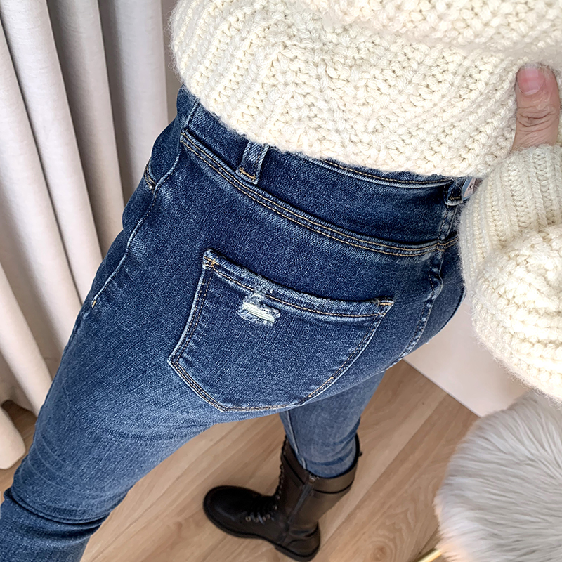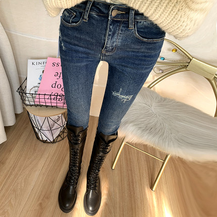深蓝色超显瘦破洞牛仔裤女薄绒弹力紧身九分铅笔裤小脚裤女小个子