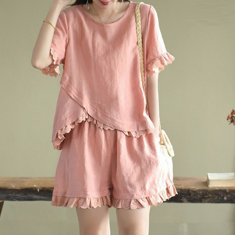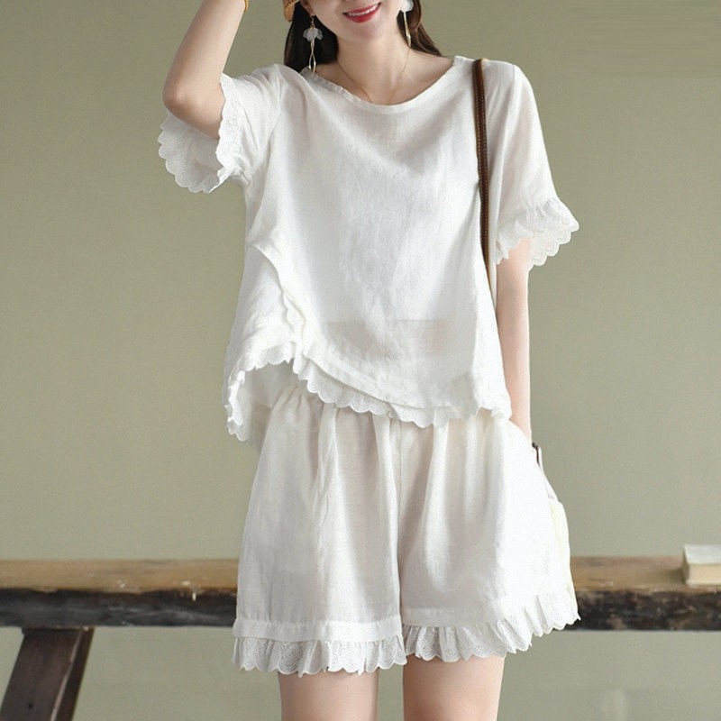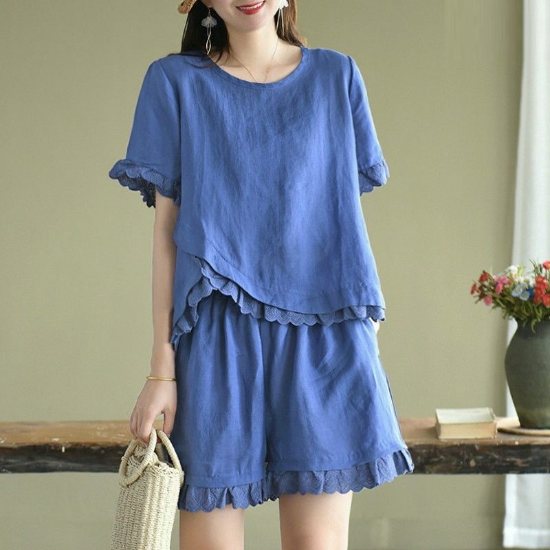 套装棉质时尚套装女款夏季文艺仿棉麻t恤短袖上衣阔腿短裤两件套