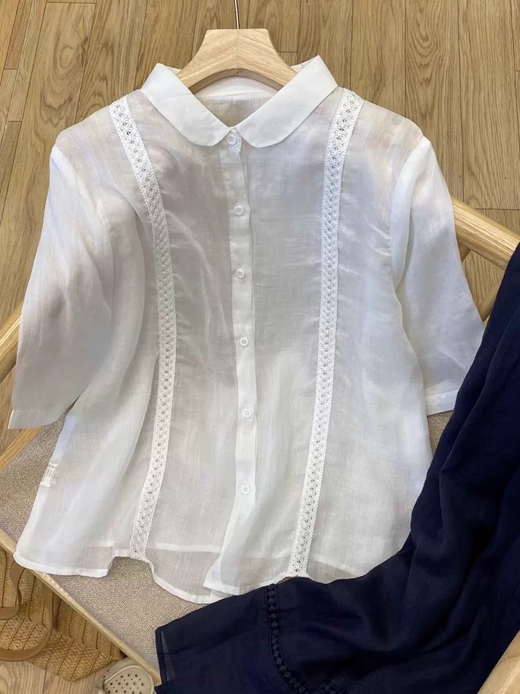 纯色五分袖衬衫轻薄复古翻领上衣