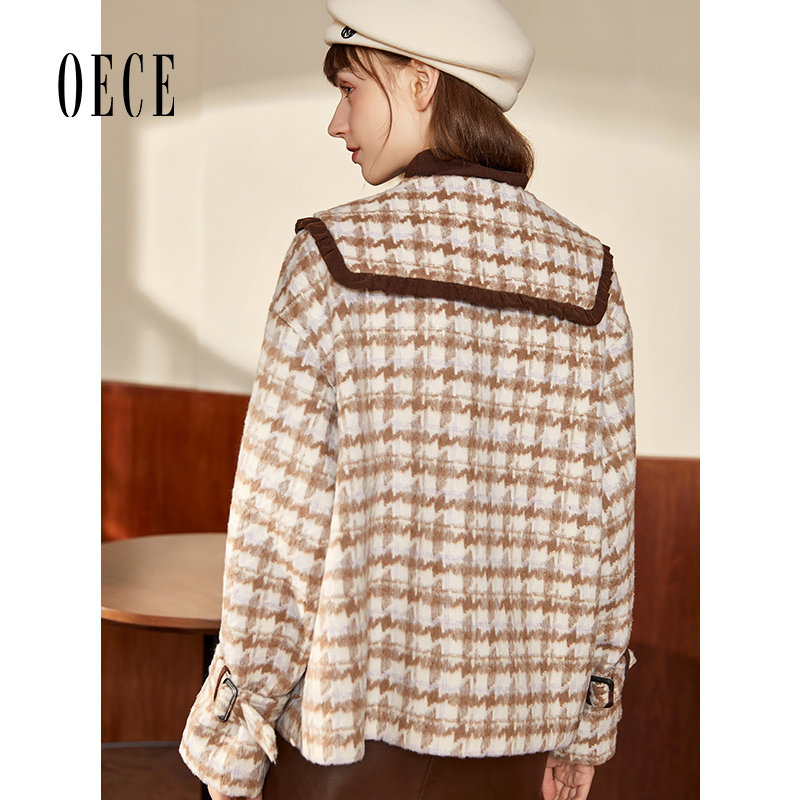 Oece毛呢外套冬季新款复古格子外套气质呢子呢大衣女