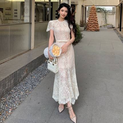 2025秋季流行穿搭法式优雅气质米色蕾丝长款短袖连衣裙鱼尾长裙子