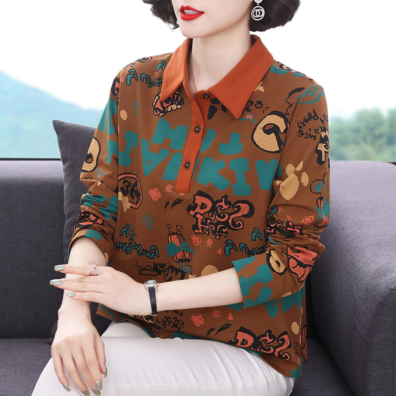 翻领纯棉长袖t恤女中老年洋气上衣50多岁妈妈秋装宽松大码打底衫