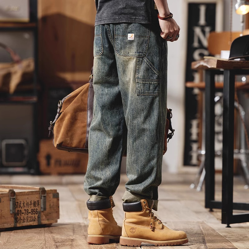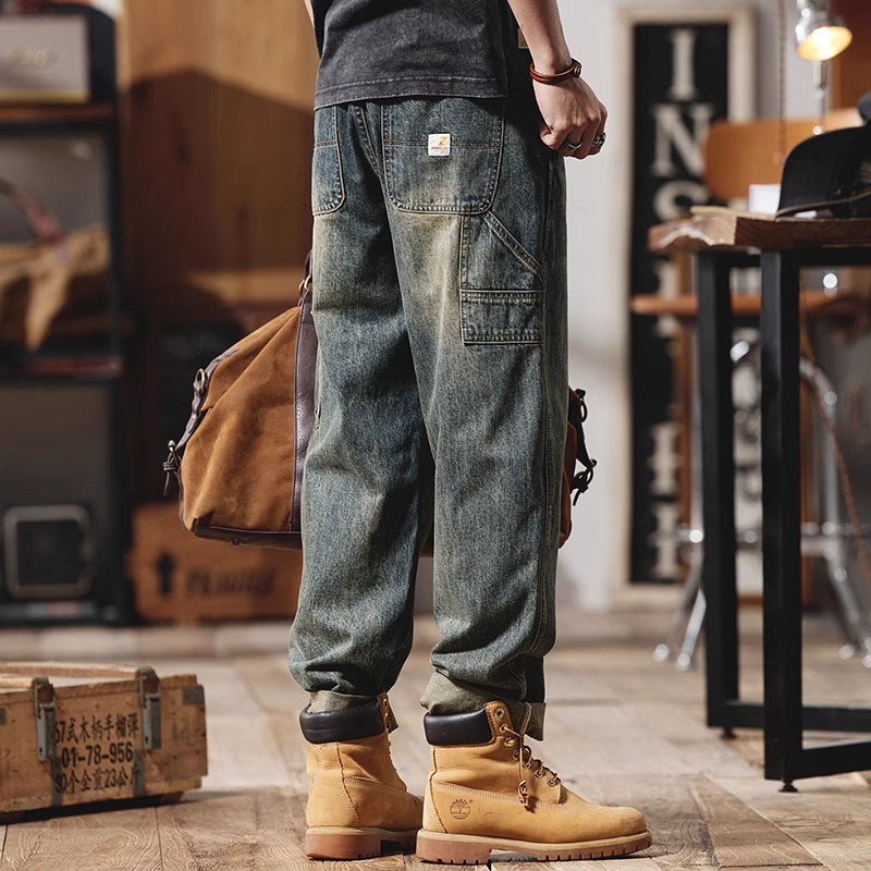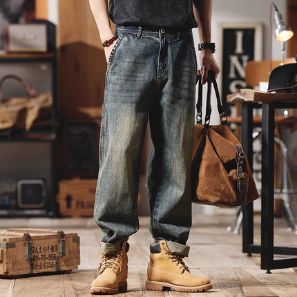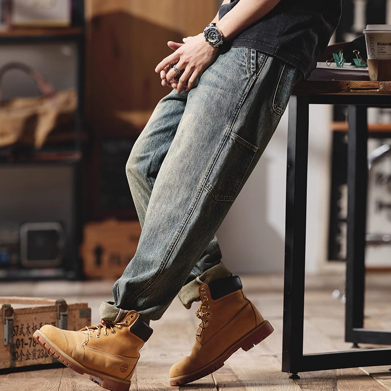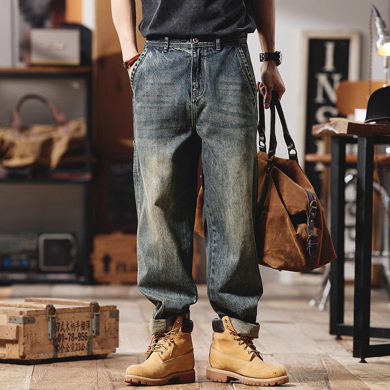 大码美式复古牛仔裤男士夏季新款宽松微锥直筒休闲水洗工装长裤潮