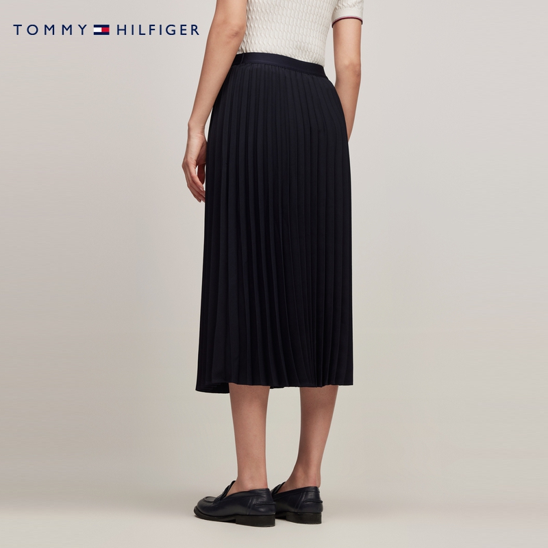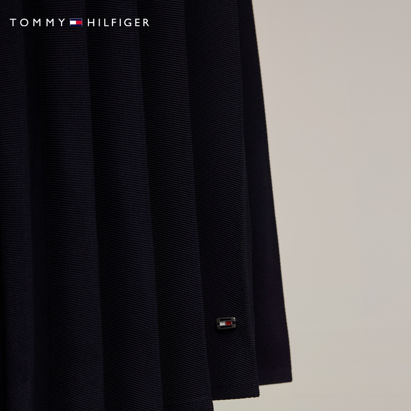 Tommy春夏女装气质通勤休闲织带松紧腰边中长百褶A字微喇半身裙