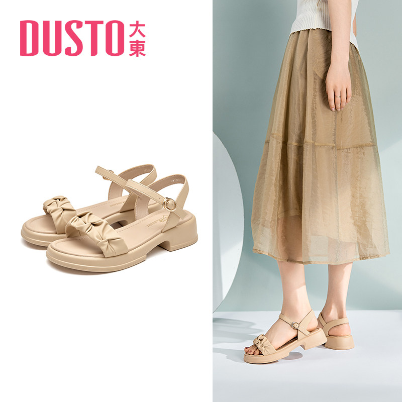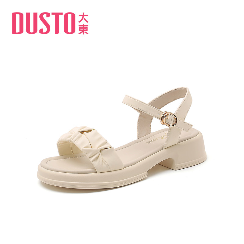 大东一字带凉鞋女鞋2025年夏季甜美纯色褶皱中跟粗跟一字扣鞋0220