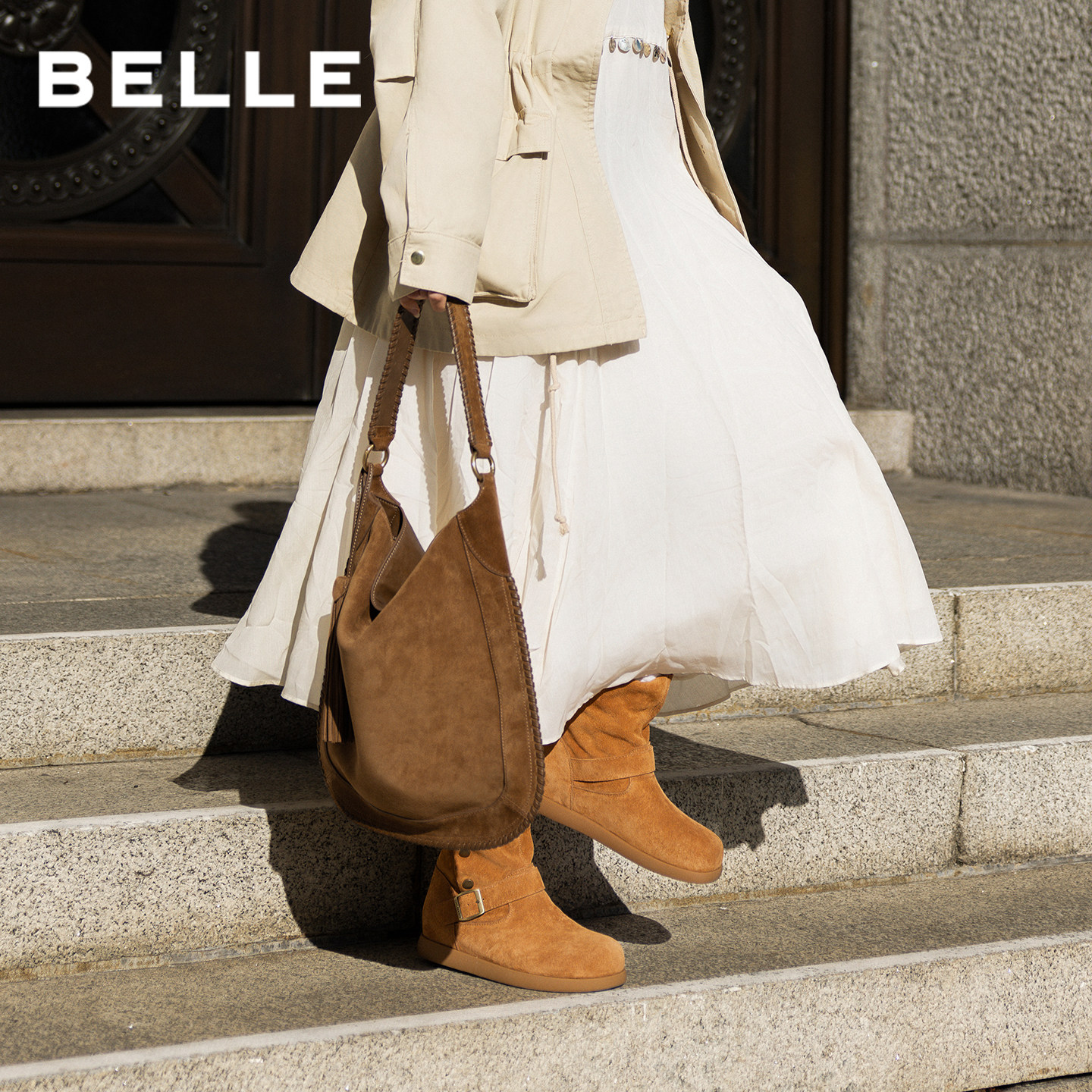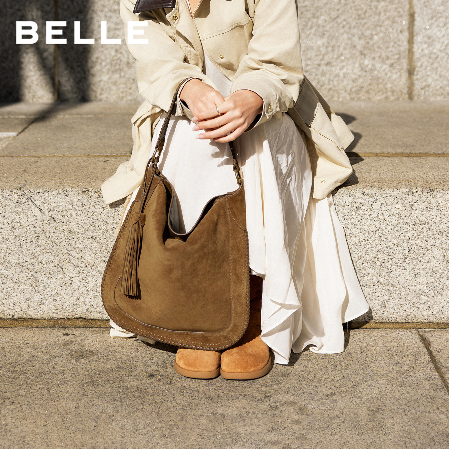 百丽包包女25冬季新款反绒麂皮波嬉风流苏斜挎托特包大号9916BDX5