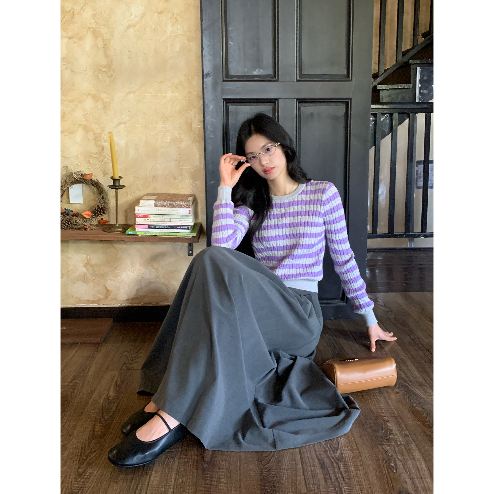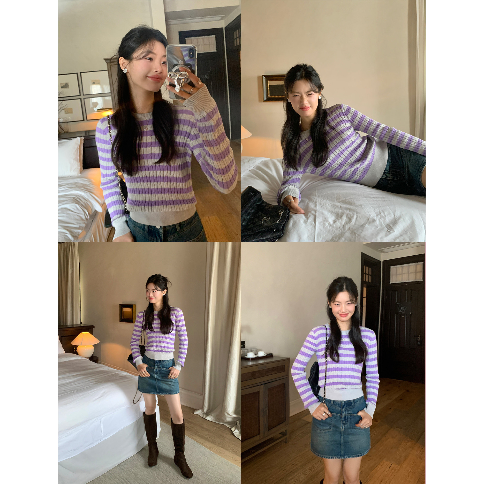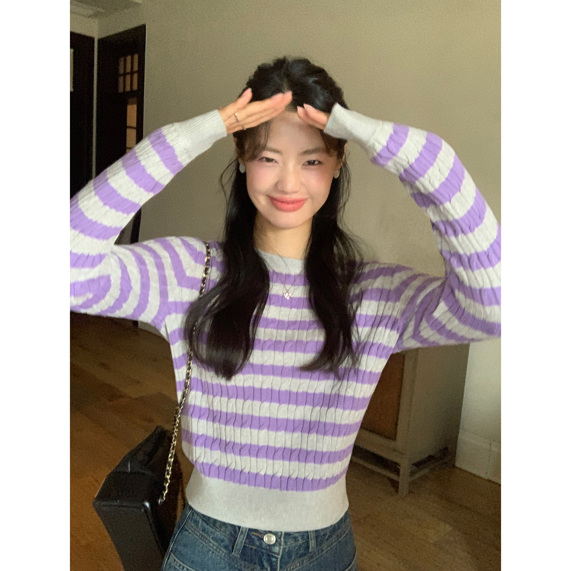 pusumede【现货6折】圆领条纹针织衫女宽松套头毛衣内搭打底衫