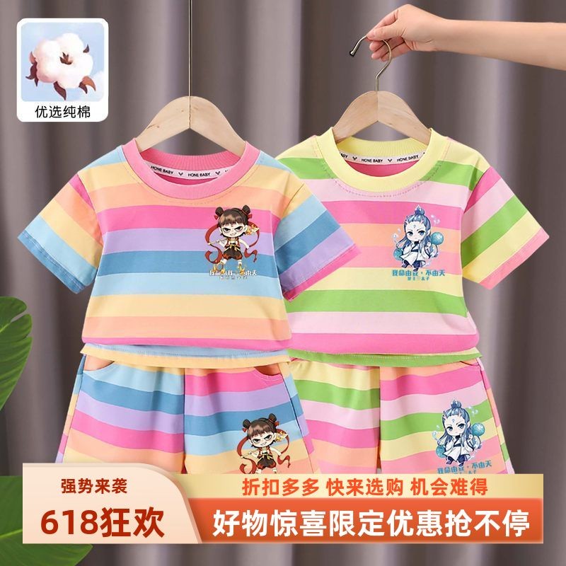 女童男童彩条烫画短袖短裤套装2025年夏季新款纯棉可爱休闲中大童