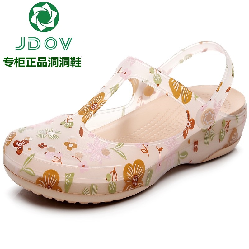 JDOV印花洞洞鞋女夏季坡跟厚底学生沙滩鞋软底包头防滑凉拖鞋外穿