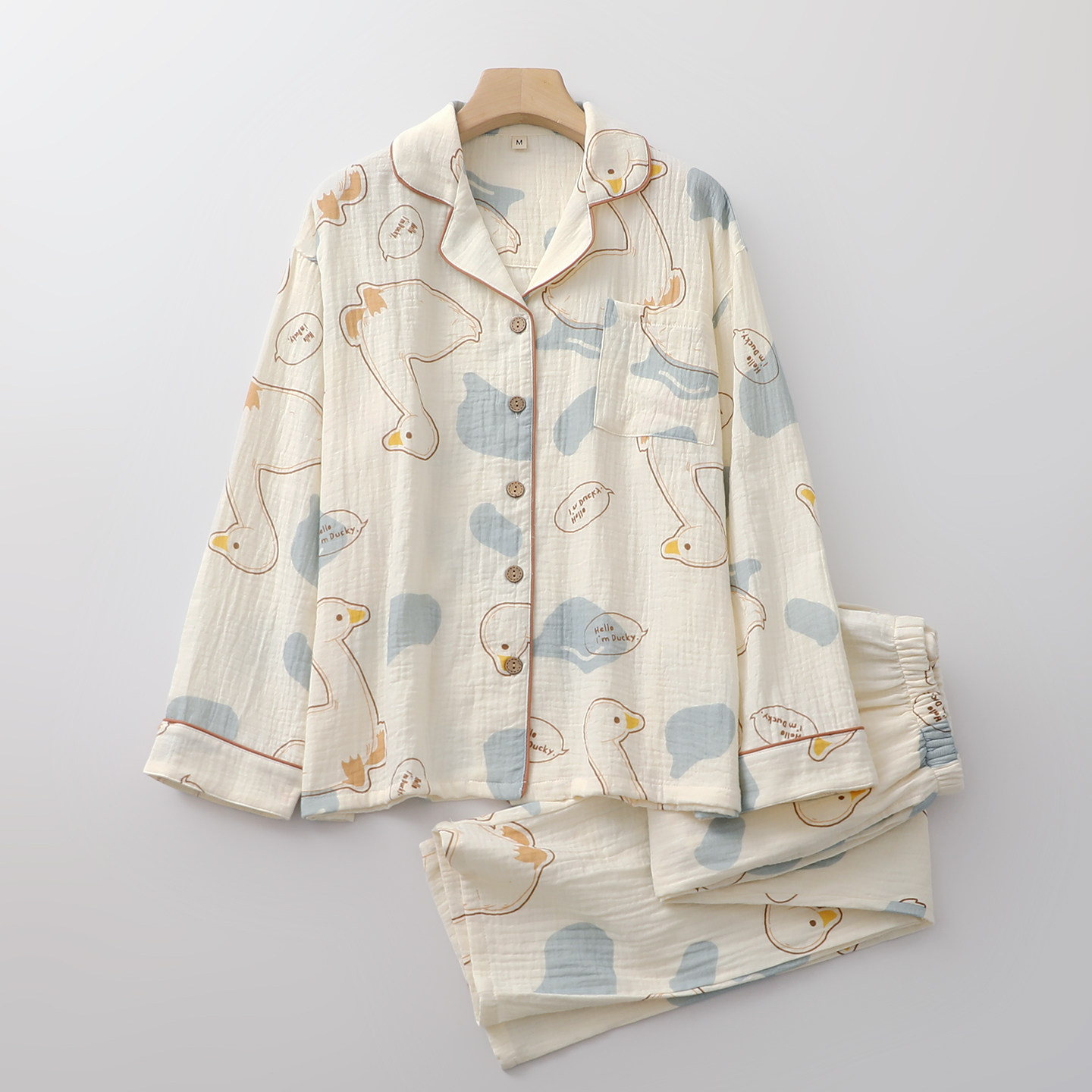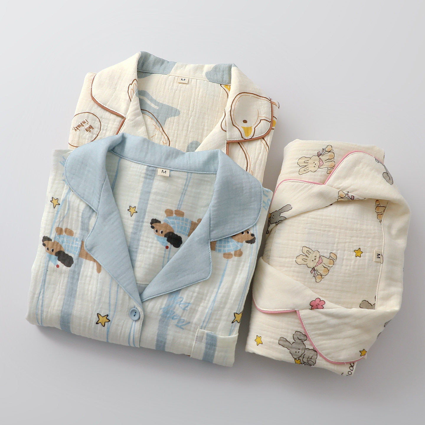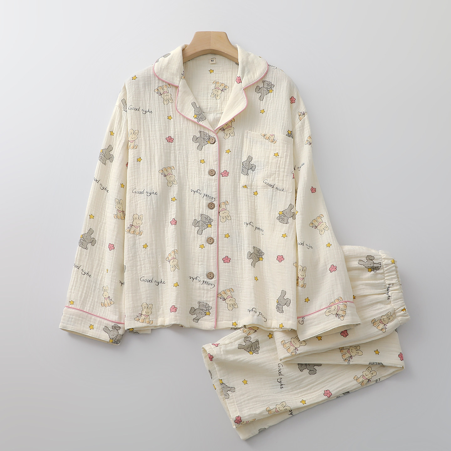 出口卡通翻领睡衣女士纯棉纱日系翻领长袖长裤春夏薄款家居睡眠服