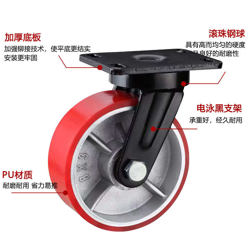 6寸8寸10寸12寸重型设备耐磨定向轮子万向刹车轮超重型铁芯PU脚轮