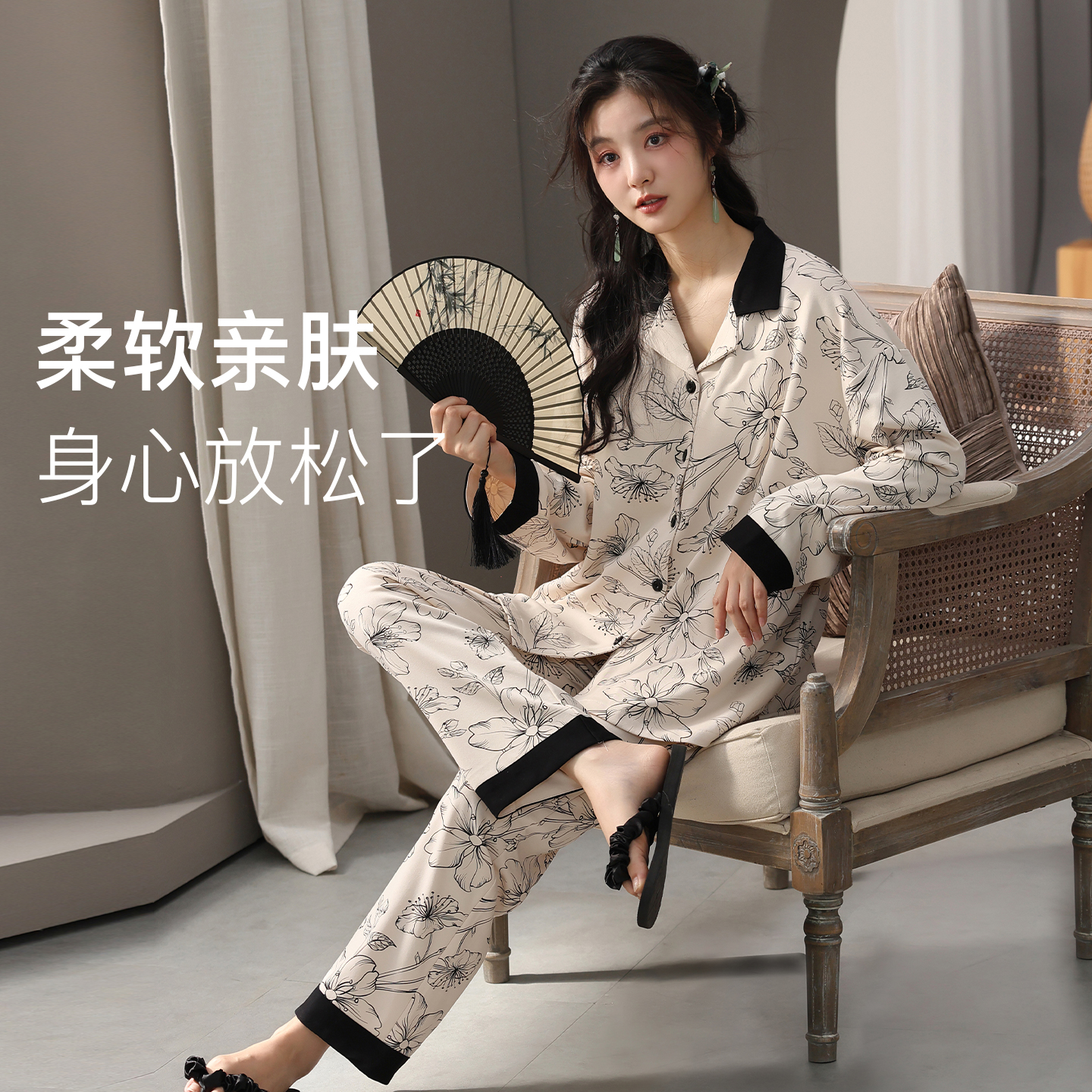 2025新款睡衣女士带胸垫一体可外穿古风纯棉家居服套装春秋季长袖