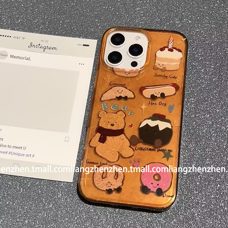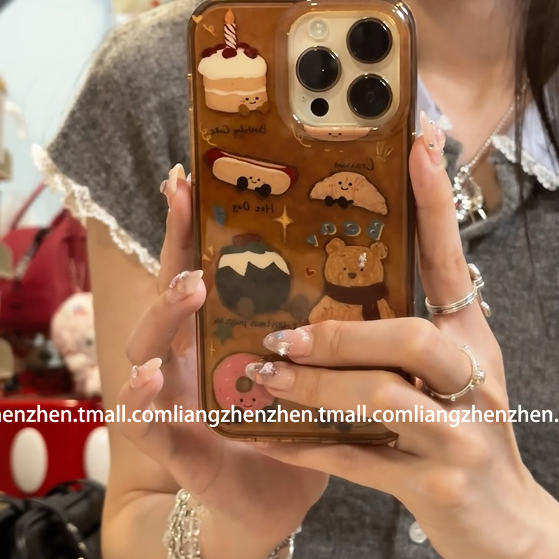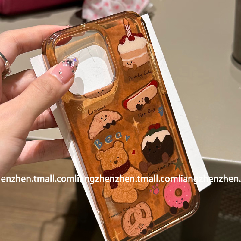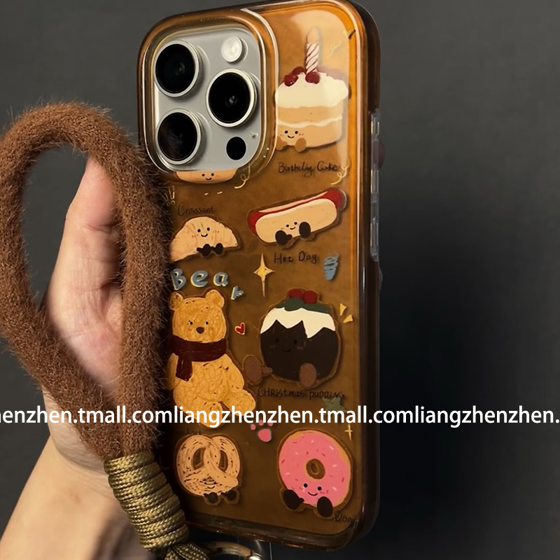 可爱棕色牛角包小熊带手绳适用苹果17promax手机壳iphone16pro女款15新款13趣味14卡通网红小众少女心个性潮