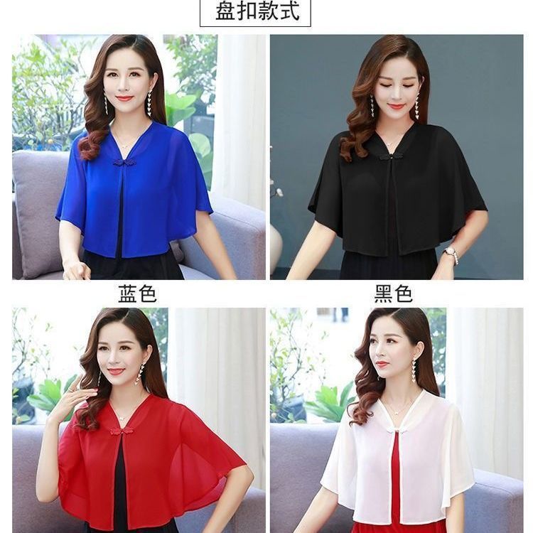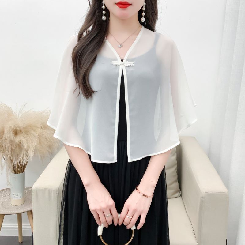 夏季女V领薄款开衫中袖防晒小外套短款配裙子披肩雪纺斗篷式外搭