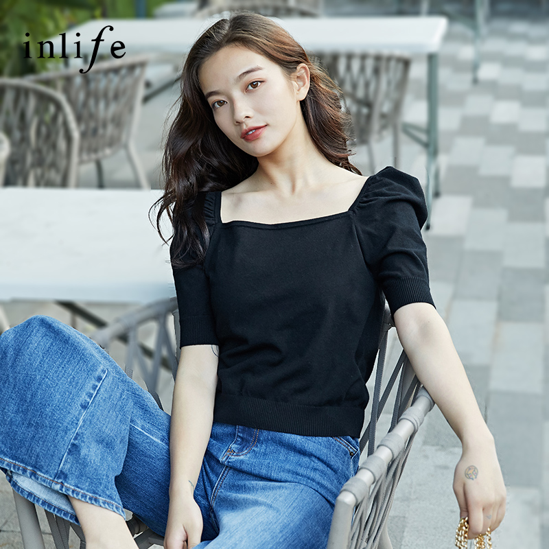 伊纳芙泡泡袖针织衫女2025短袖气质方领薄款冰丝上衣修身显瘦小衫