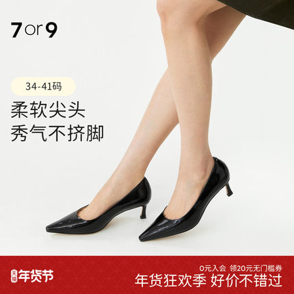 7or9女鞋黑色高跟鞋真皮舒适尖头细跟通勤职业不累脚浅口单鞋澳黑