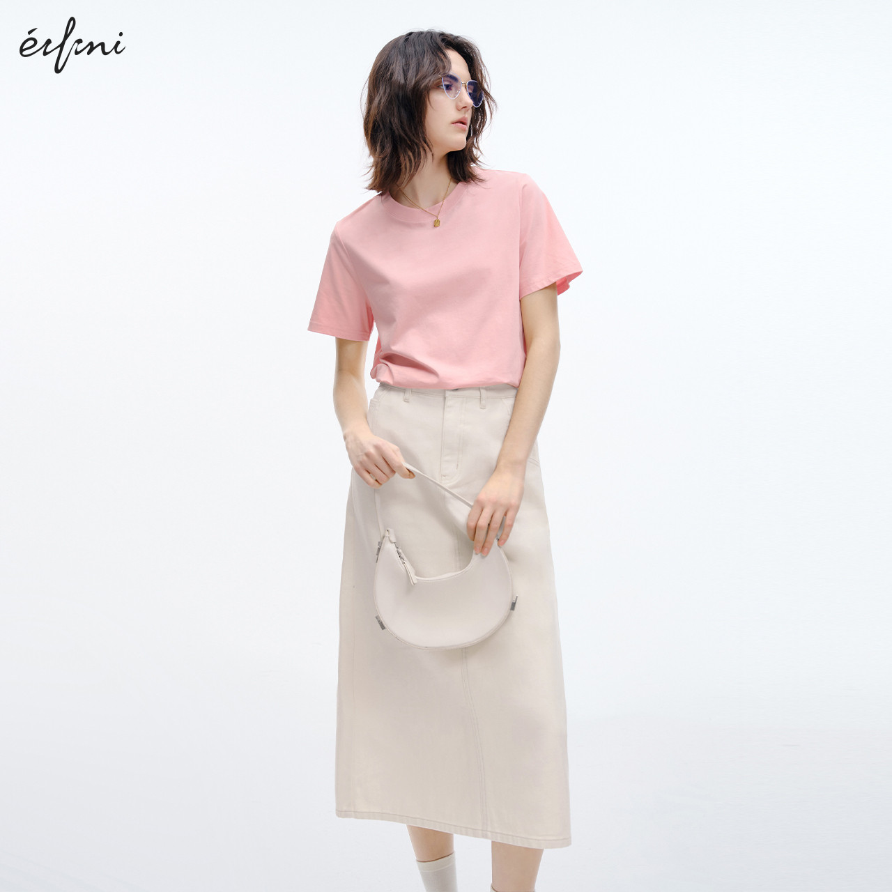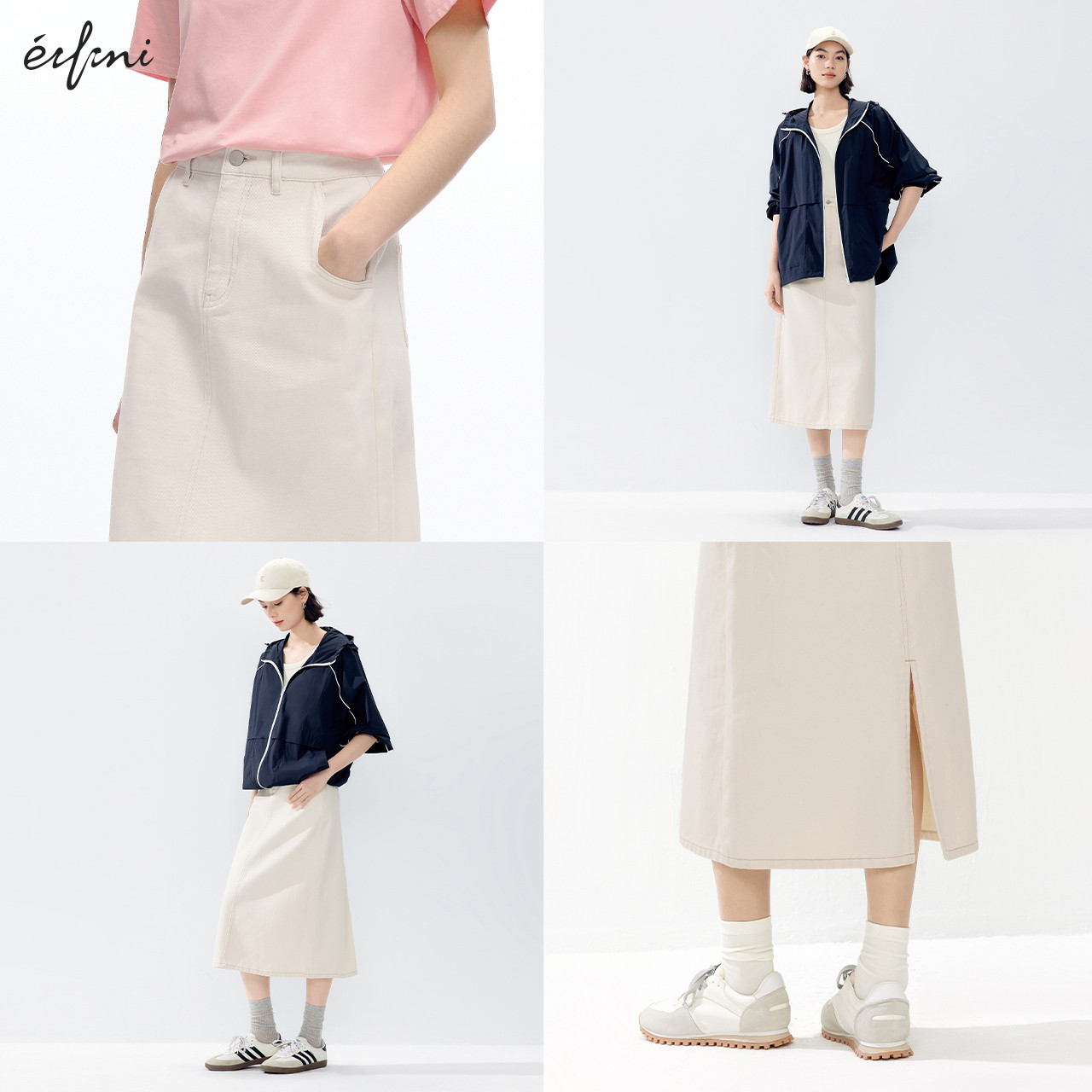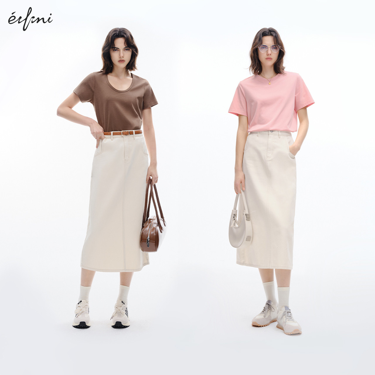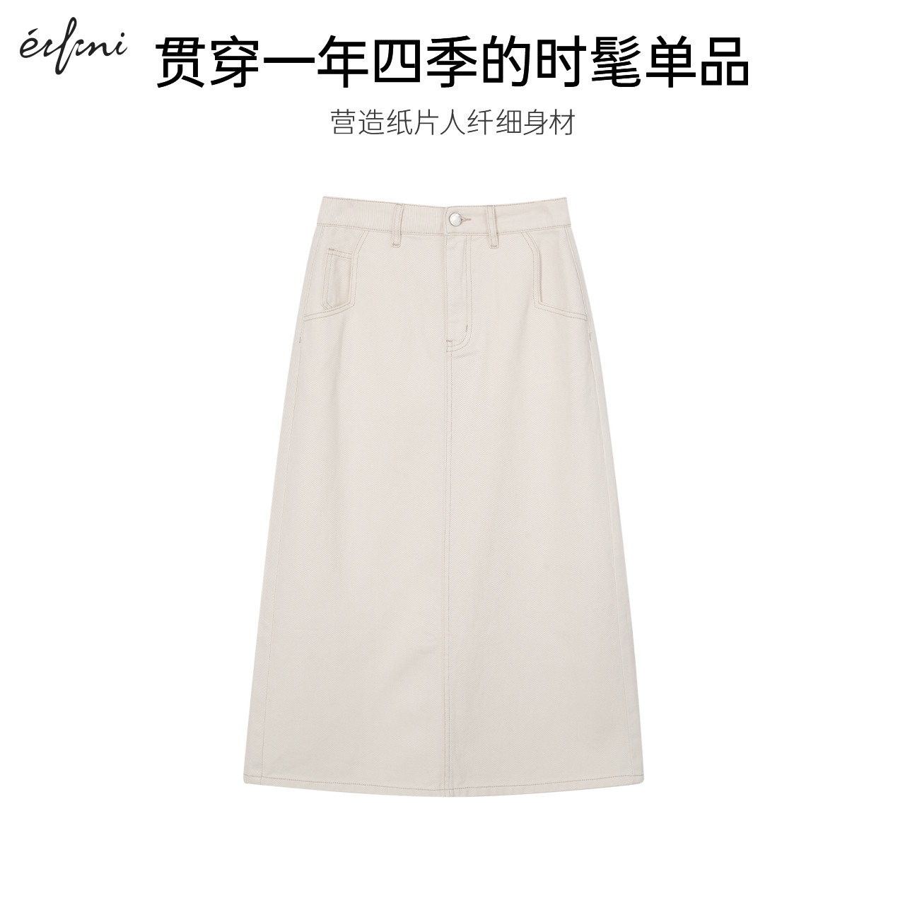 伊芙丽outlets店淡人高腰直筒后开衩白色牛仔半身裙春夏中长裙女