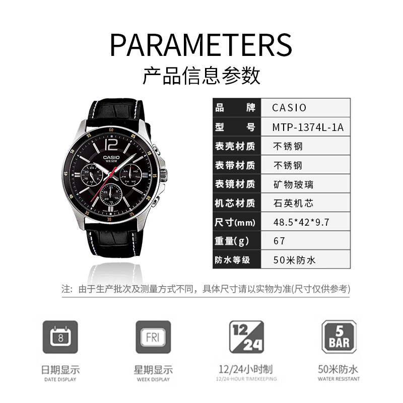 casio卡西欧手表男防水潮流商务休闲简约皮带石英表MTP-1374L-1A