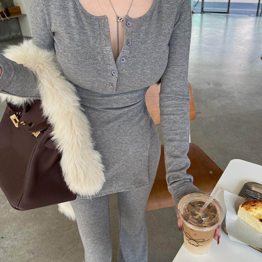 ALA秋新款韩国辣妹排扣U领开衩长袖T恤高腰微喇裤休闲套装女