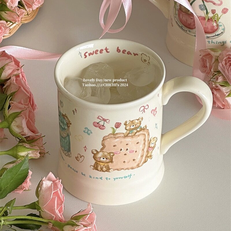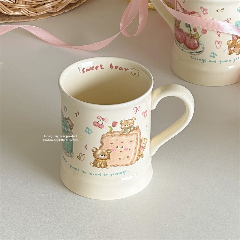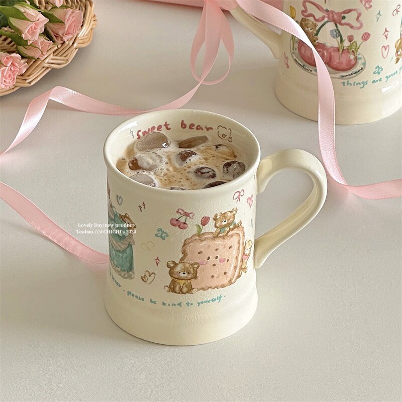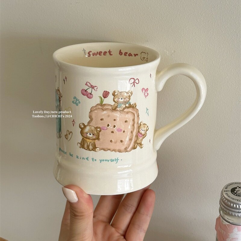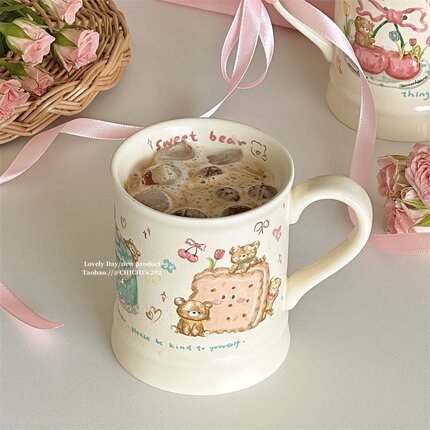 填满少女心~超可爱手绘风小熊曲奇饼干奶油色马克杯咖啡开学水杯
