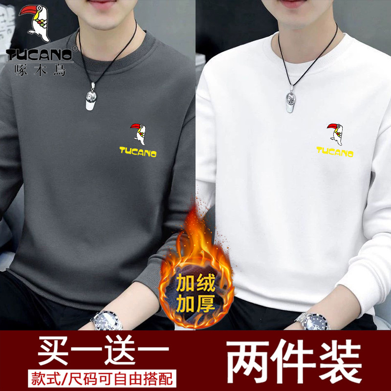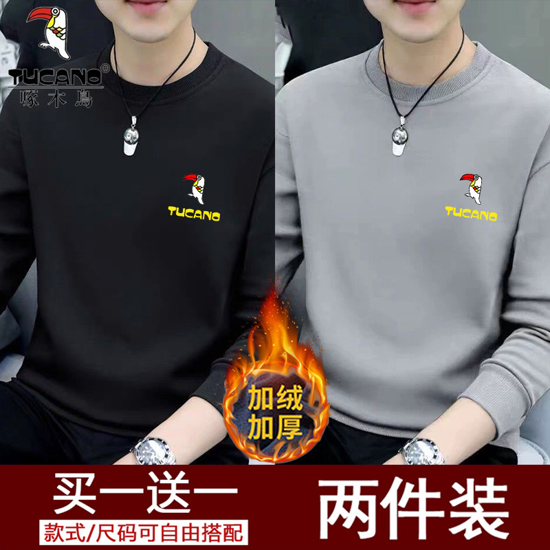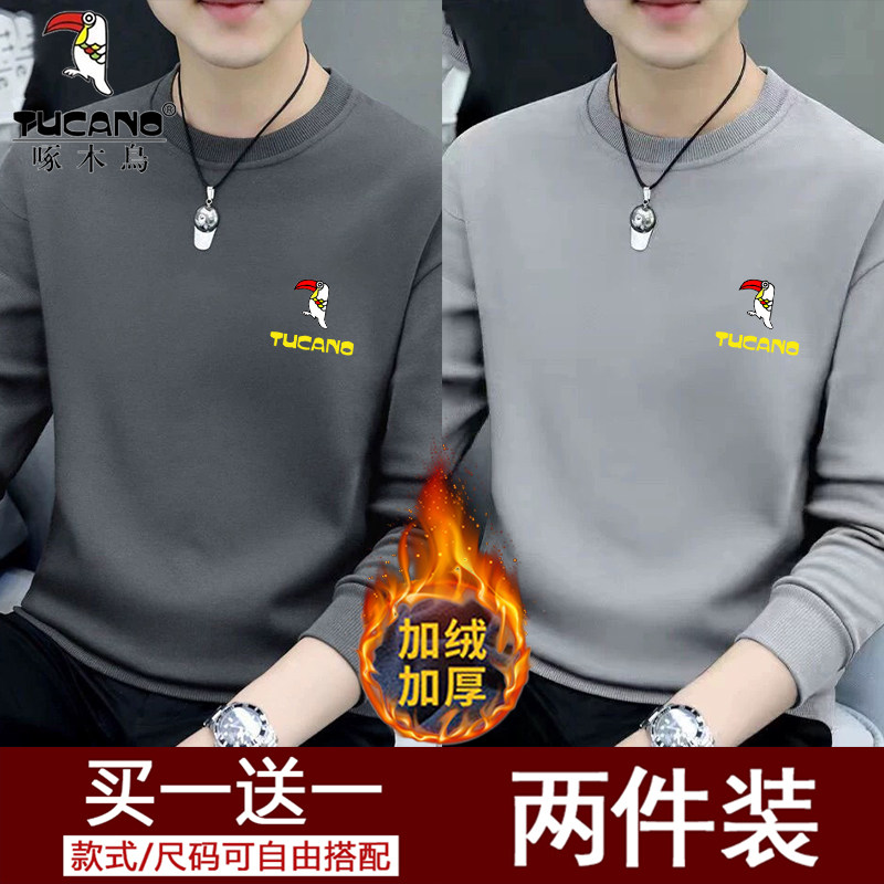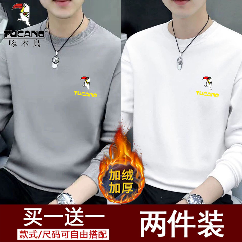 啄木鸟春秋新款卫衣男圆领加绒长袖男士T恤冬季保暖上衣打底衫男