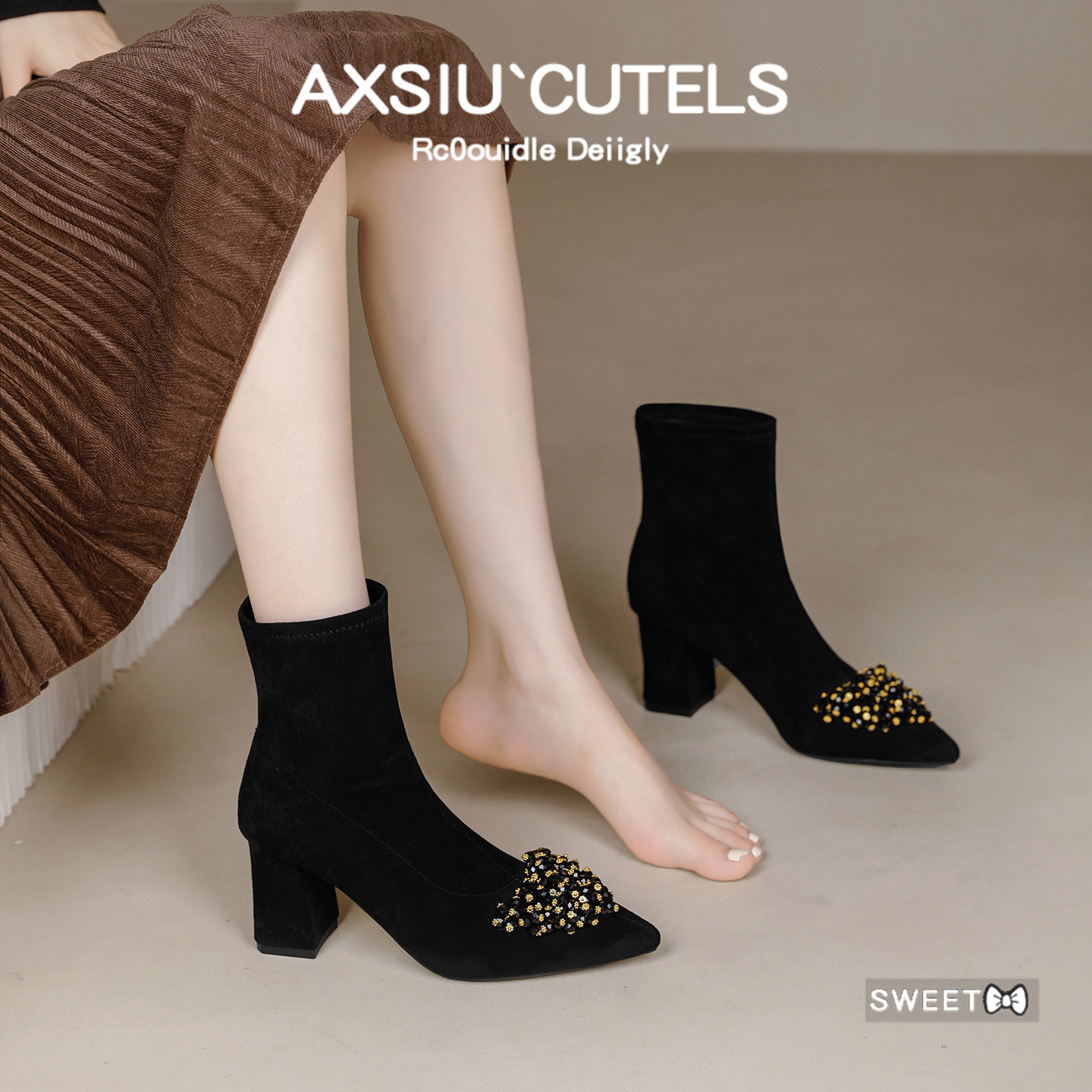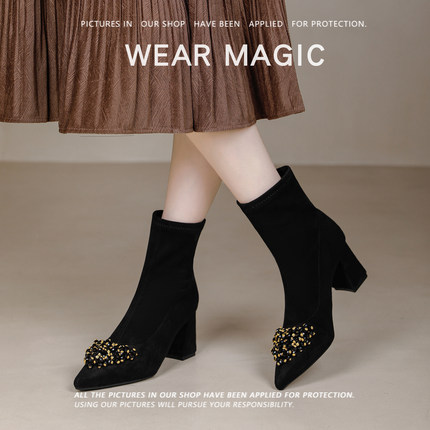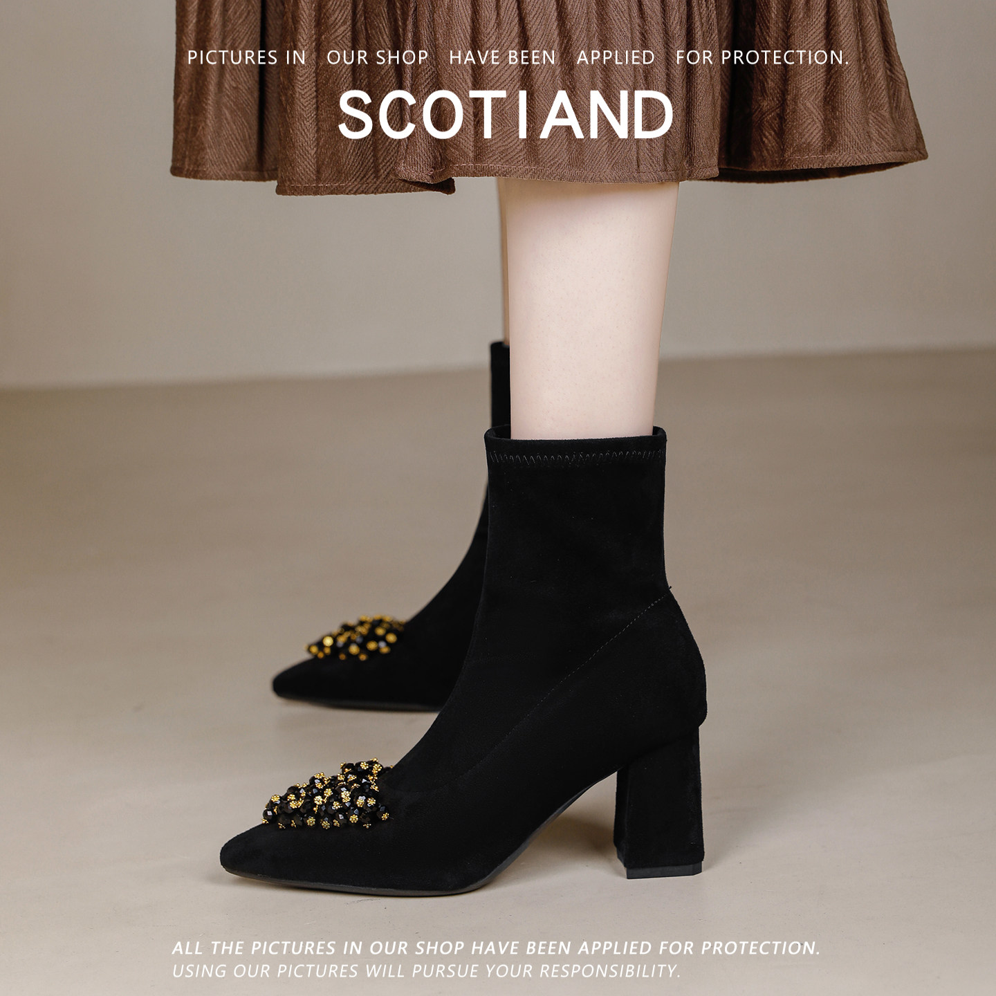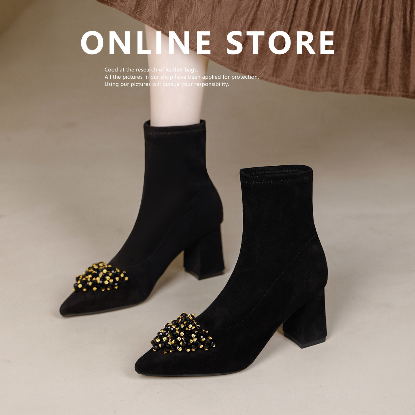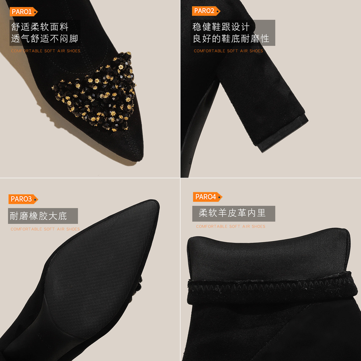 高跟短靴女显瘦2025秋冬新款法式尖头粗跟秋冬单靴黑色及棕瘦瘦靴
